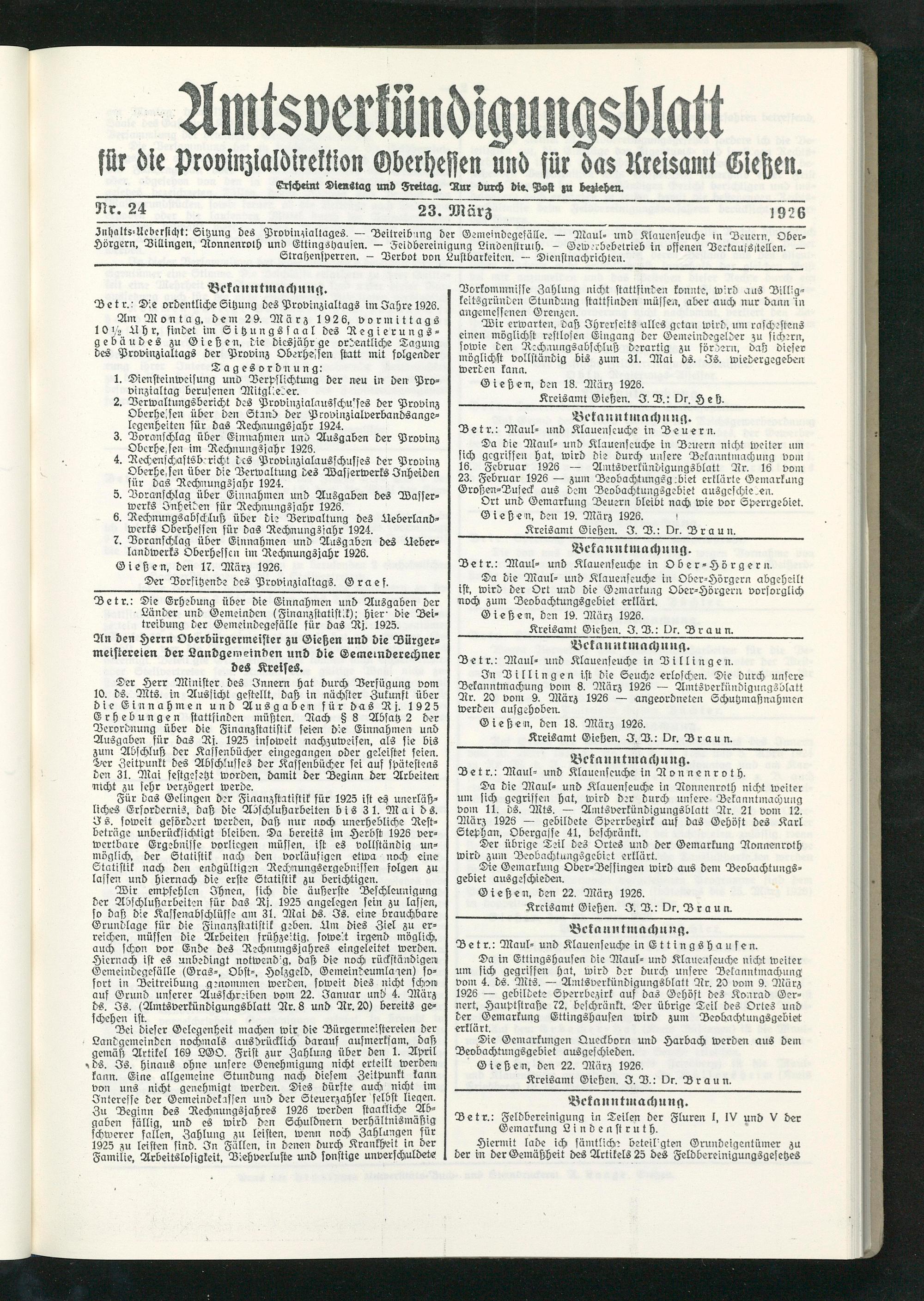 3nl)alts=Ucbcrficl)t: Sitzung des Provinzialtages. — Beitreibung der Gemeindegefälle. — Maul- und Klauenseuche in Beuern, Ober- Hörgern, Dillingen, Aonnenroth und Ettingshausen. — Feidbereinigung Lindenstruih. - Gewerbebetrieb in offenen Verkaufsstellen. — __Straßensperren. - Verbot von Lustbarkeiten. — Dienstnachrichten.