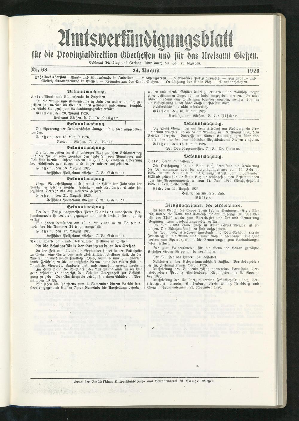 Inhalts-Aebersicht: Maul- und Klauenseuche in Inheiden. — Straßensperren. — Verlorener Polizeiausweis. — Gartenbau - und Elektrizitätsausstellung in Gießen. — Krematorium der Stadt Gießen. — Ortssatzung der Stadt Lich. — Dienstnachrichten.