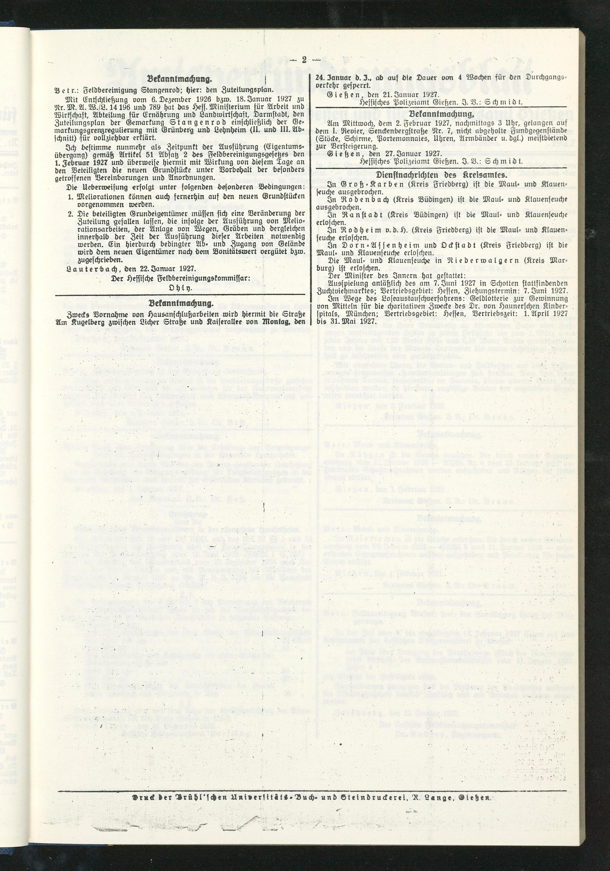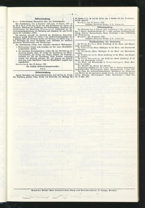 Mit Entschließung vom 6. Dezember 1926 bzw. 18. Januar 1927 zu Nr. M. 21. W./L. 14 196 und 789 hat das Hess. Ministerium für Arbeit und Wirtschaft, Abteilung für Ernährung und Landwirtschaft, Darmstadt, den Zuteilungsplan der Gemarkung Stangenrod einschließlich der Ge- markungsgrengregulierung mit Grünberg und Lehnheim (II. und III. Abschnitt) für vollziehbar erklärt.