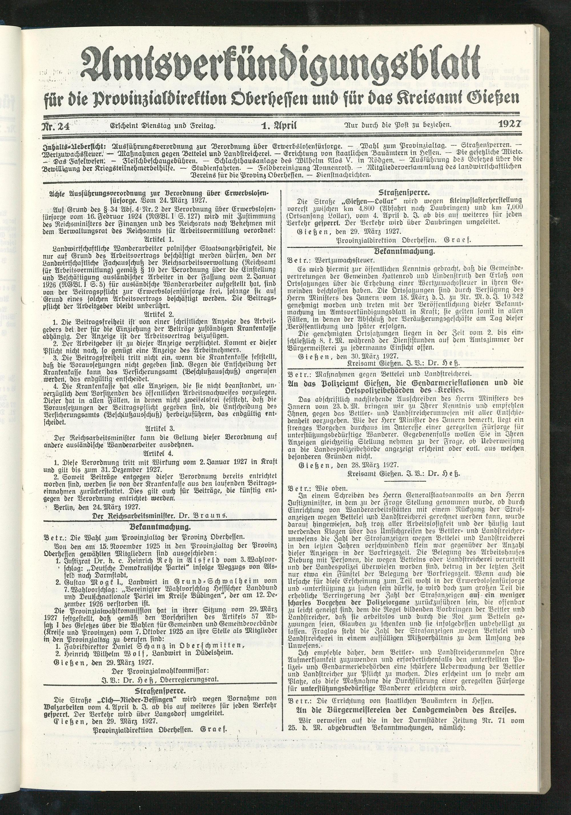Juhaltö-lAebersicht: Ausführungsverordnung zur Verordnung über Erwerbslosenfürsvrge. — Wahl zum Provinzialtag. — Straßensperren. — Wertzuwachssteuer.'— Maßnahmen gegen Bettelei und Landstreicherei. — Errichtung von staatlichen Bauämtern in Hessen. — Die gesetzliche Miete. Das Faselwefen; — Zleischbeschaugebühren. — Schlachthausanlage des Wilhelm Klos V. in Rödgen. — Ausführung des Gesetzes über die Bewilligung der Kriegsteilnehmerbeihilfe. -- Studienfahrten. — Feldbereinigung Aonnenroth. — Mitgliederversammlung des landwirtschaftlichen Vereins für die Provinz Oberhessen. — Dienstnachrichten- _______________________