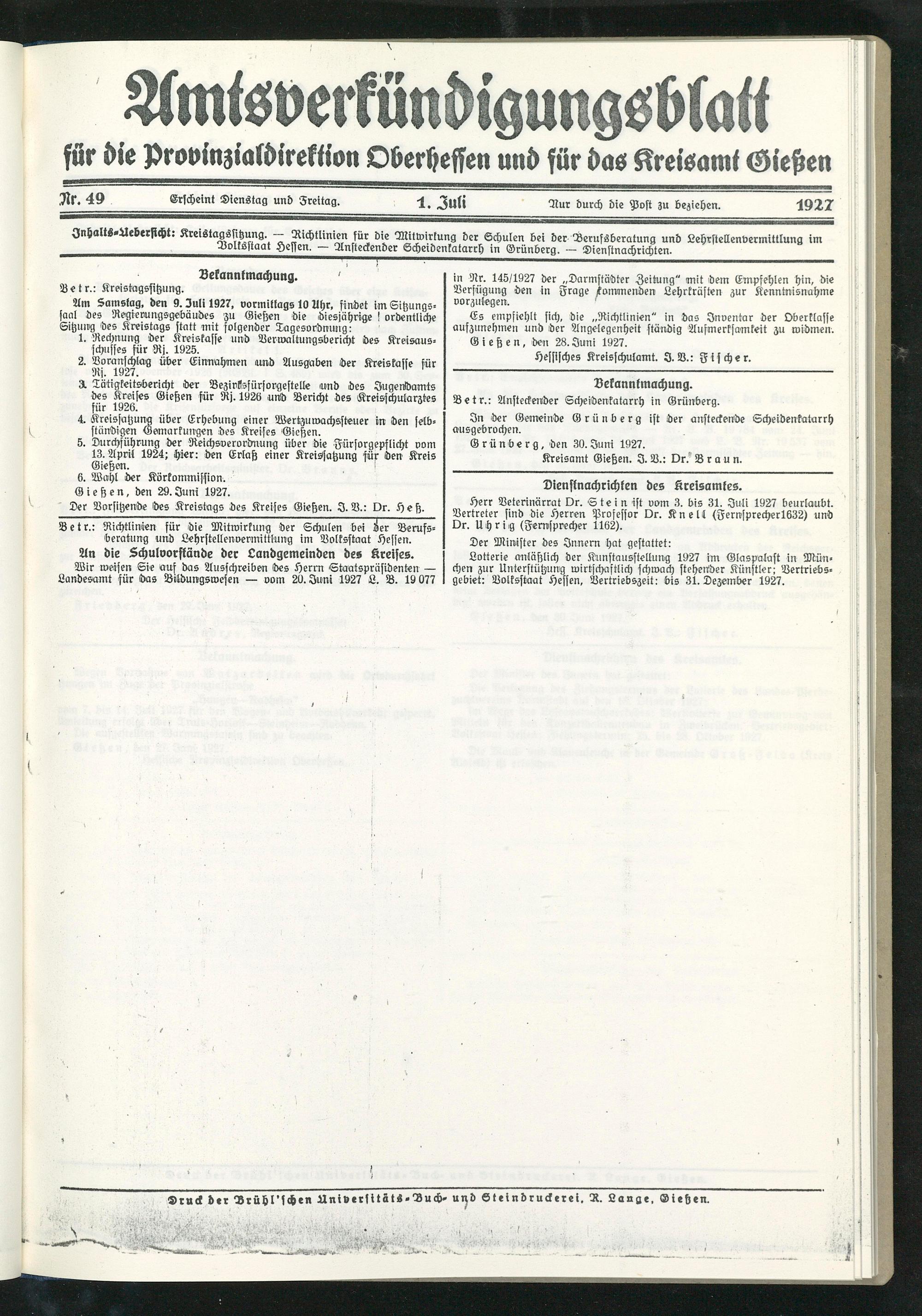 Jnhalts-Aeberficht: Kreistagssitzung. — Richtlinien für die Mitwirkung der Schulen bei der Berufsberatung und Lehrstellenvermittlung im Bolksstaat Hessen. — Ansteckender Scheidenkatarrh in Grünberg. — Dienstnachrichten.