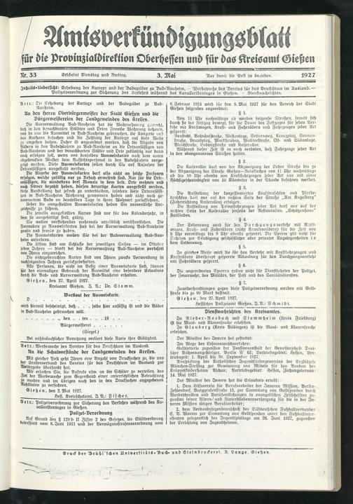 6. Februar 1924 wird für den 8. Mai 1927 für den Bereich der Stadt Gießen folgendes angeordnet: