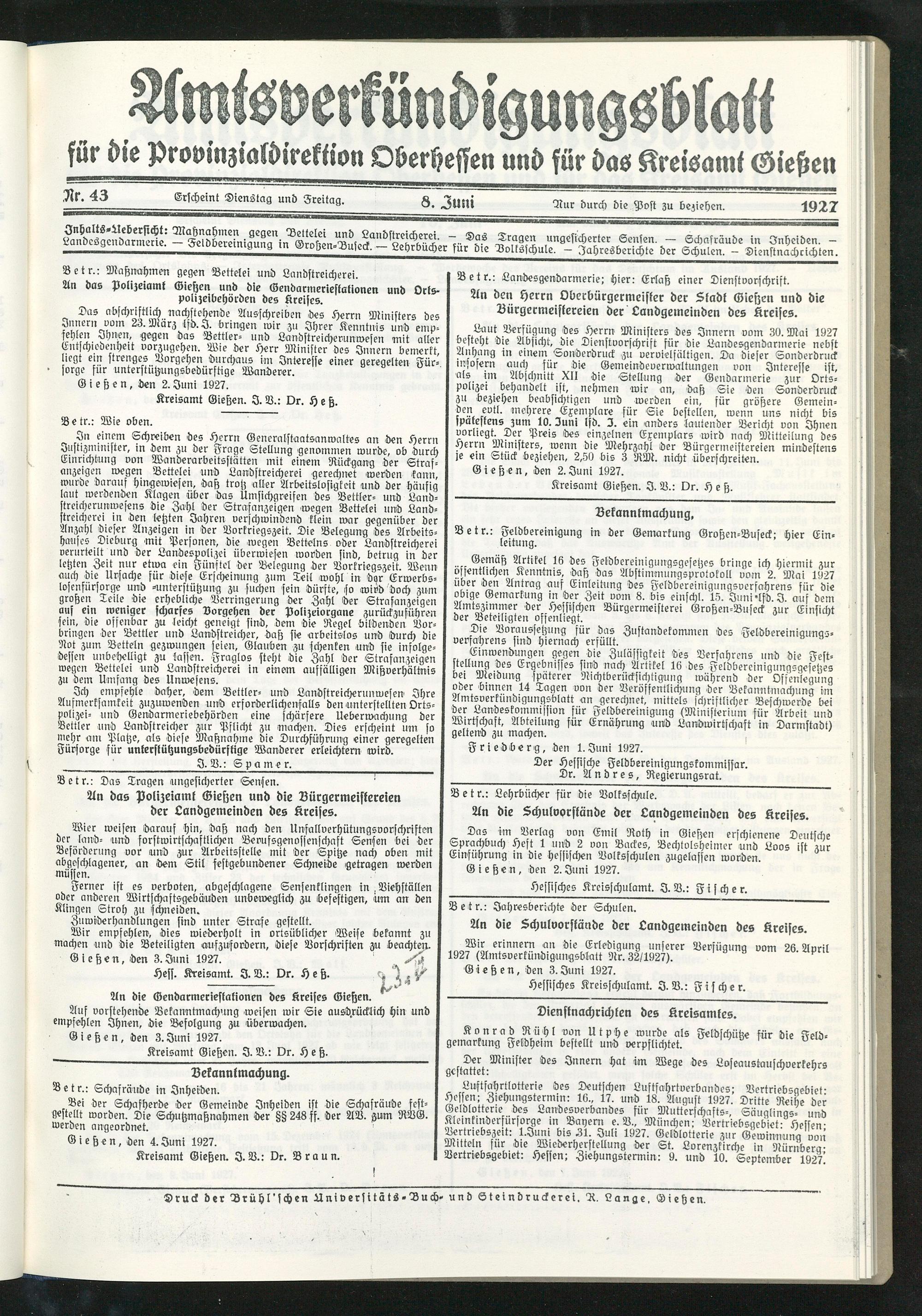 Kreisamt Gießen. I. V.: Dr. Braun.