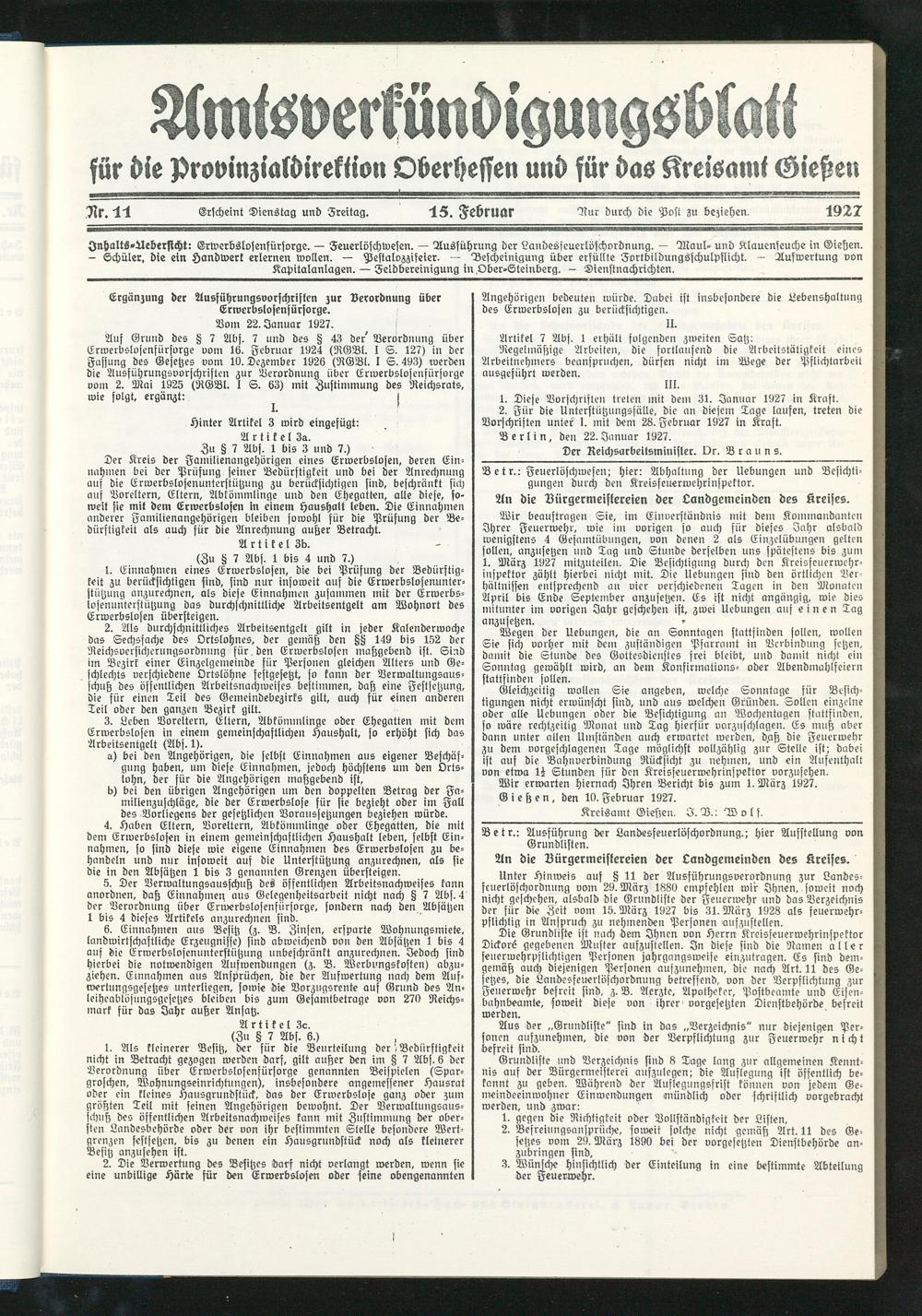 Jnhalts-Aebersicht: Erwerbslosenfürsorge. — Feuerlöschwesen. — Ausführung der Landesfeuerlöfchordnung. — Maul- und Klauenseuche in Gießen. - Schüler, die ein Handwerk erlernen wollen.. — Pestalozzifeier. — Bescheinigung über erfüllte Fortbildungsfchulpflicht. — Aufwertung von Kapitalanlagen. — Feldbereinigung in,Ober-Steinberg. - Dienstnachrichten.