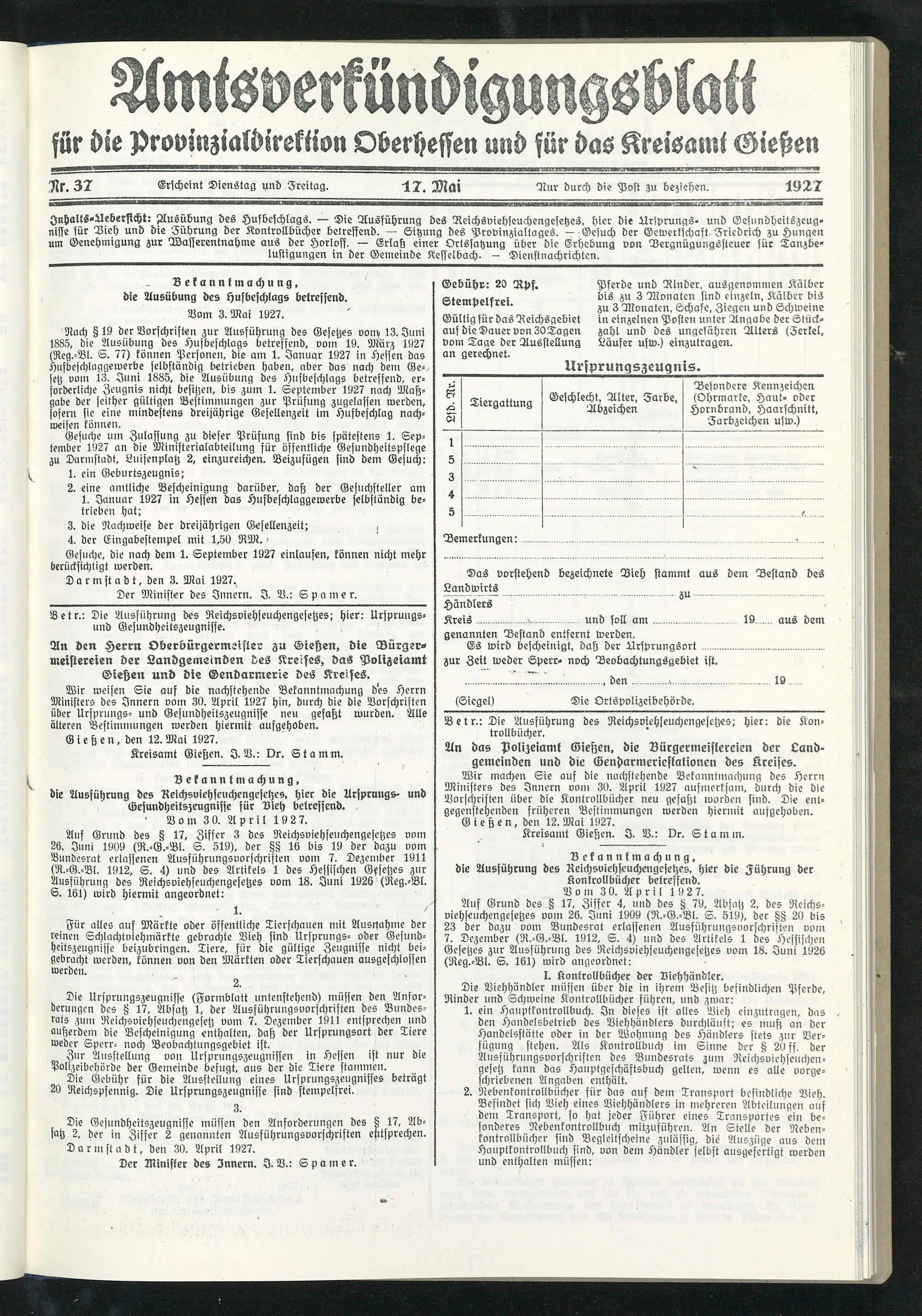 Inhalts-Aeberstcht: Ausübung des Hufbeschlags. — Die Ausführung des Reichsviehfeuchengesehes, hier die Ursprungs- und Gesnndheitszeug- nisse für Vieh und die Führung der Kontrollbücher betreffend. — Sitzung des Provinzialtages. — ^Gesuch der Gewerkschaft Friedrich zu Hungen um Genehmigung zur Wasserentnahme aus der Horloff. — Erlass einer Ortssahung über die Erhebung von Vergnügungssteuer für Tanzbe- lustigungen in der Gemeinde Kesselbach. - Dienstnachrichten.
