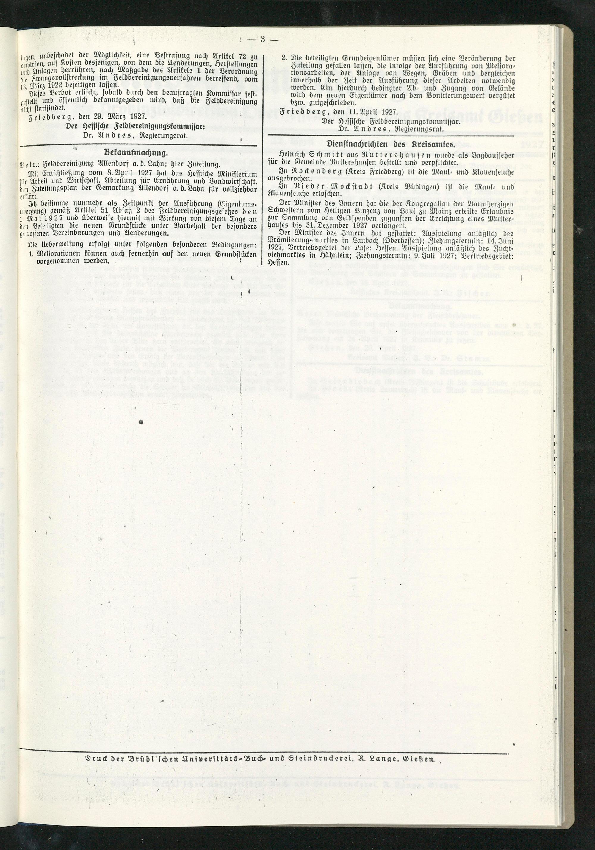 Mit Entschließung vom 8. April 1927 hat das hessische Ministerium für Arbeit und Wirtschaft, Abteilung für Ernährung und Landwirtschaft, d n Zuteilungsplan der Gemarkung Allendorf a. d.Lahn für vollziehbar erklärt.