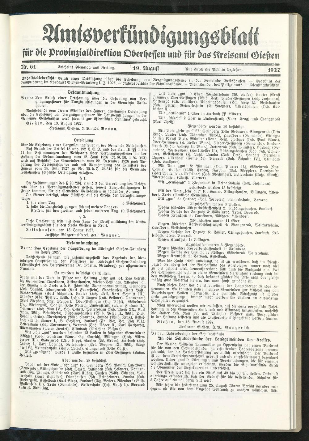 ©r^eBung t>on Vergnügungssteuer in der Gemeinde Geilshausen. — Ergebnis der Jahresberichte der Schulvorstände. — Dienststunden des Polizeiamts. — Dienstnachrichten.