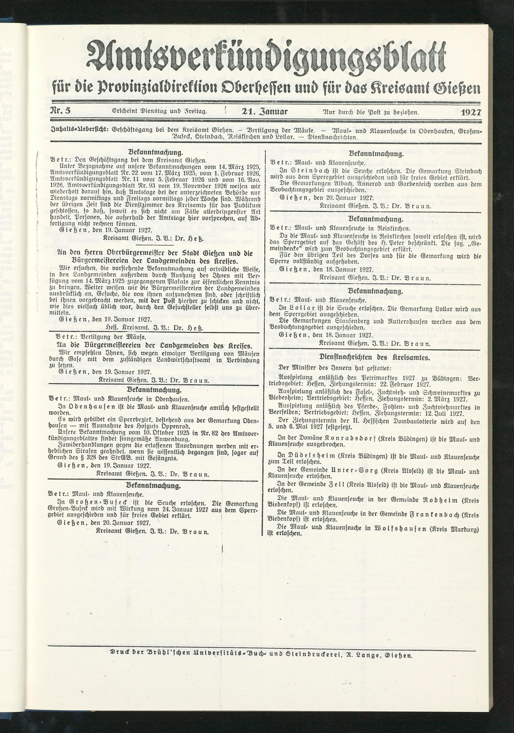 Jnhalts-Aeberstcht: Geschäftsgang bei dem Kreisamt Gießen. — Vertilgung der Mäuse. — Maui- und Klauenseuche in Odenhausen, Großen» Bufeck, Steinbach, Reiskirchen und Lollar. — Dienstnachrichten.