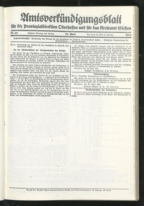 Kreisamt Gießen. I. V.: Dr. Stamm.
