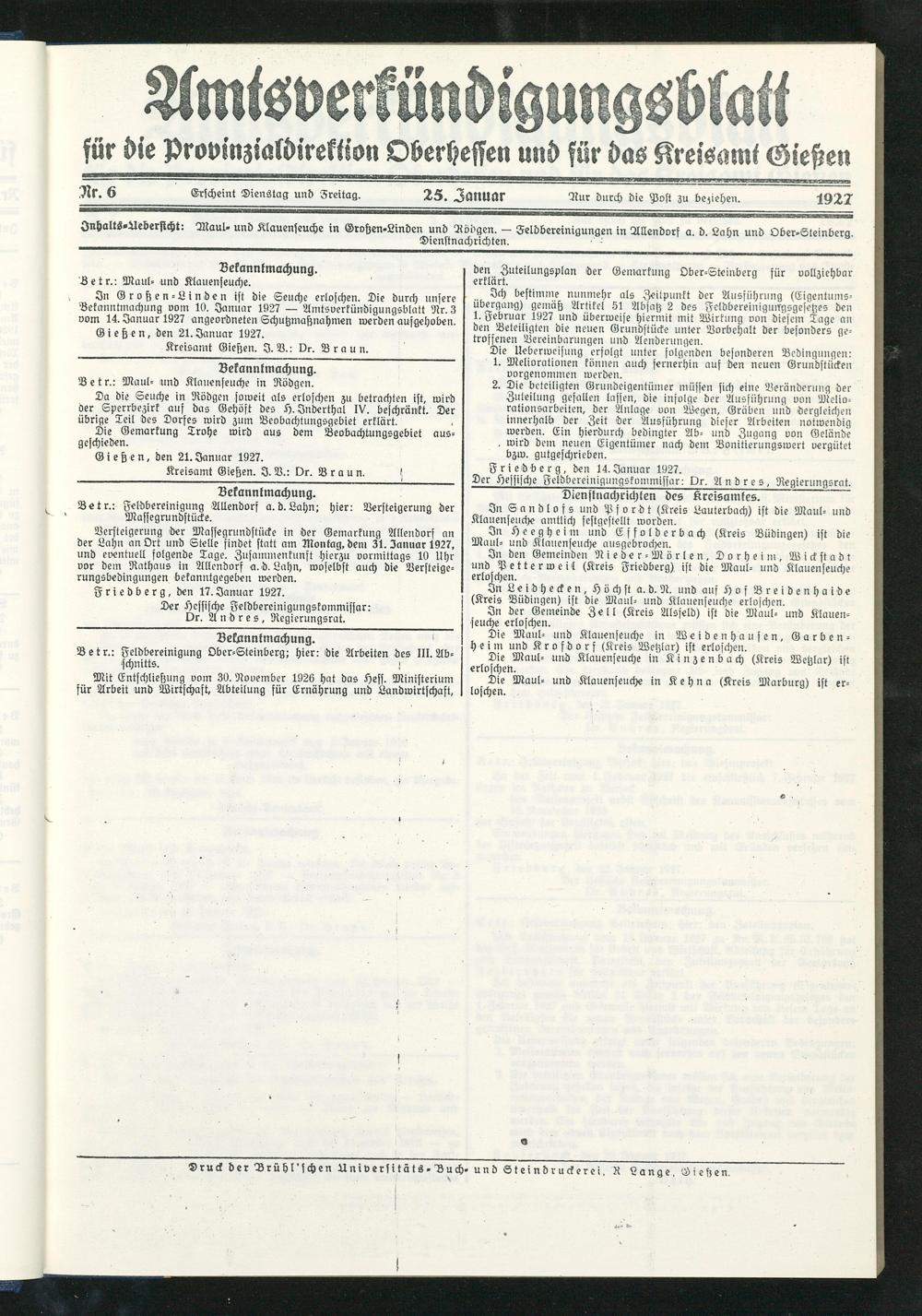 Jnhalts-Aebersicht: Maul, und Klauenseuche in Grohen-Linden und Aödgen. - Feldbereinigungen in Allendorf a. d. Lahn und Ober°Steinberg ____________________________________ Dienstnachrichten.