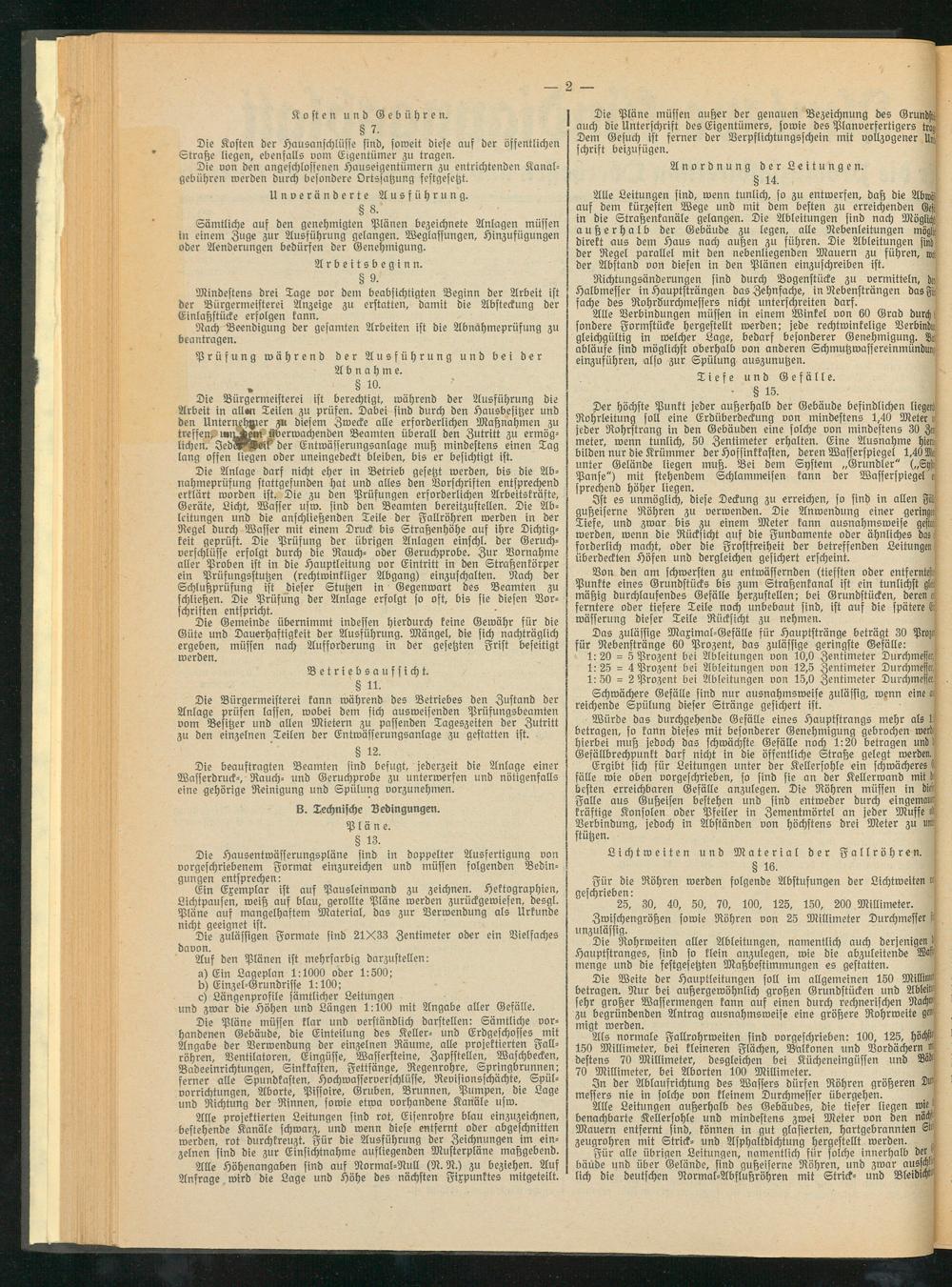 Die Weite der Hauptleitungen soll im allgemeinen 150 Millnst betragen. Nur bei außergewöhnlich großen Grundstücken und Ableist sehr großer Wassermengen kann auf einen durch rechnerischen Nackst zu begründenden Antrag ausnahmsweise eine größere Rohrweite g® migt werden.