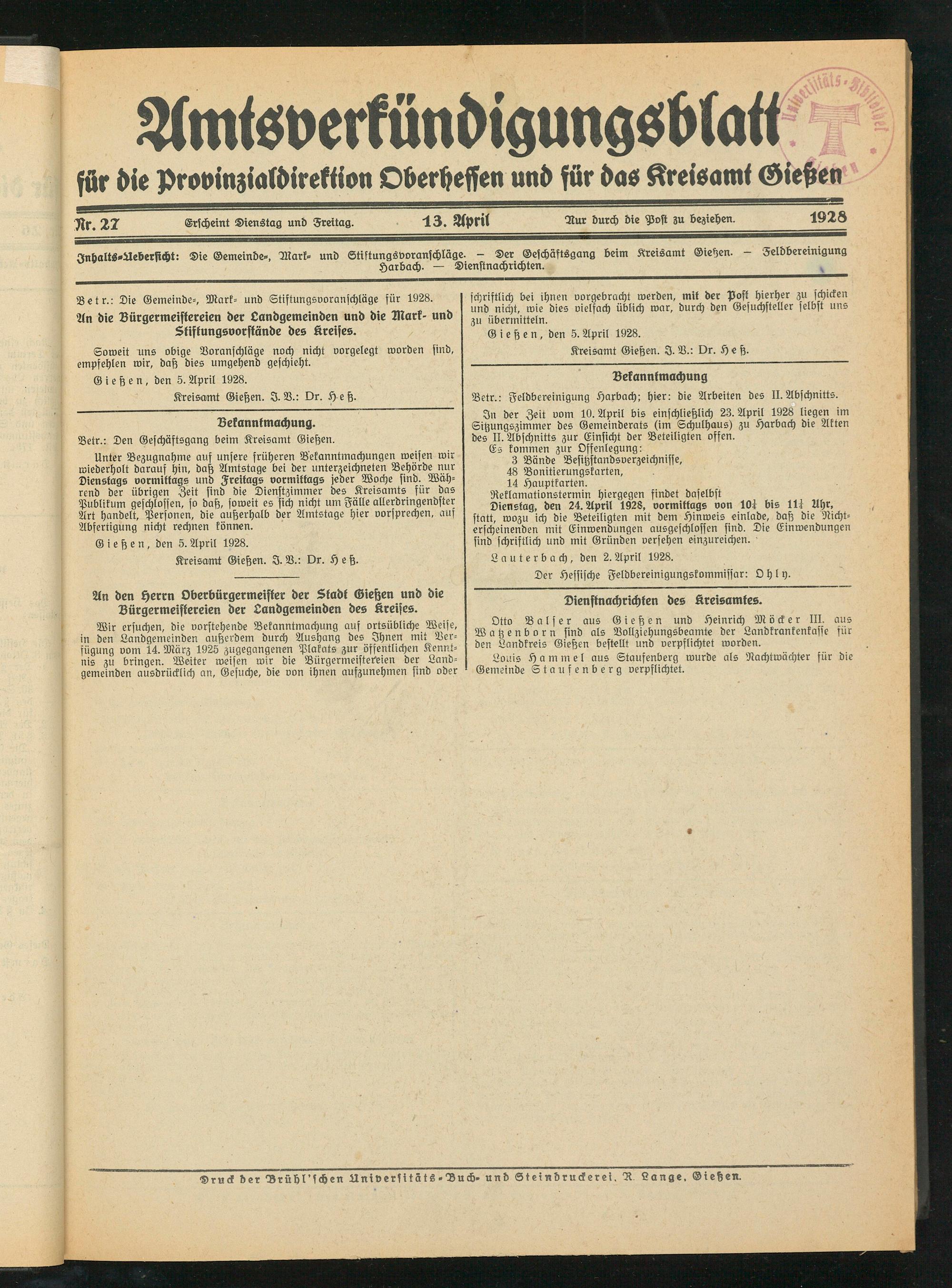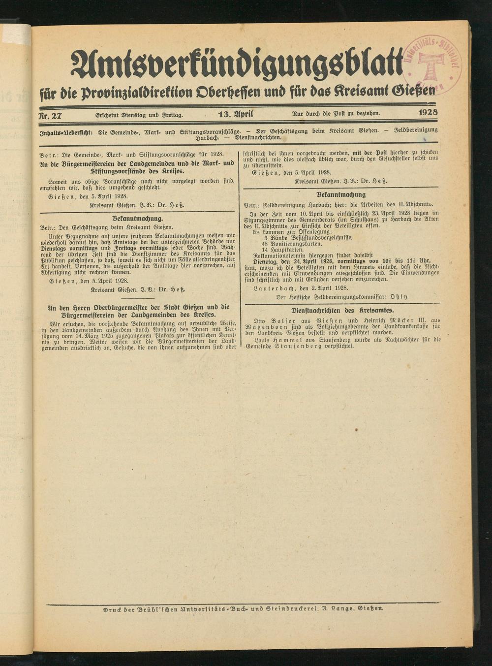 Kreisamt Gießen. I. V.: Dr. Heß.