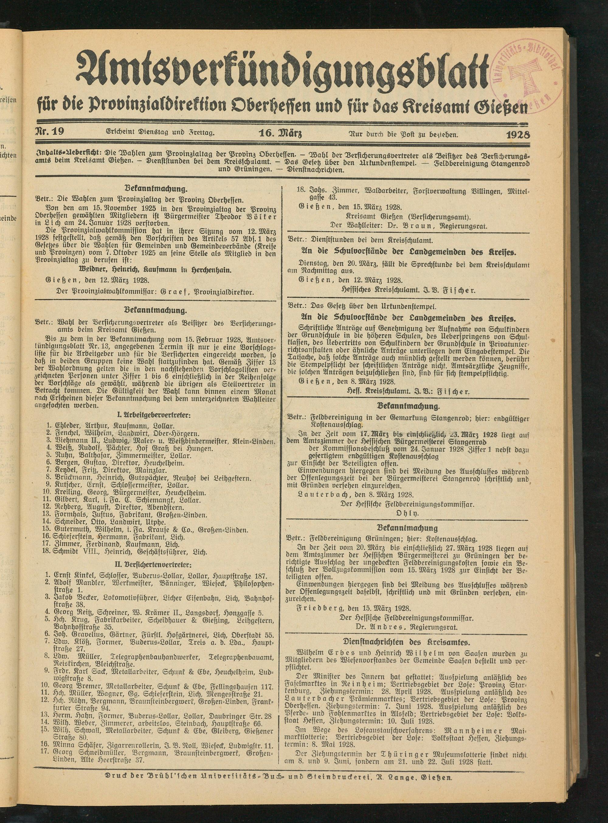 3nbülts-Aebersicht: Die Wahlen zum Prvvinzialtag der Provinz Oberheffen. - Wahl der Versicherungsvertreter als Beisitzer des Berffcherungs- amts beim Kretsamt Gtehen. Dtenststunden bei dem Kreisschulamt. — Das Gesetz über den Aikundenstempei. — Feldbereinigung Stangenrod und Grüningen. — Dienstnachrichten.