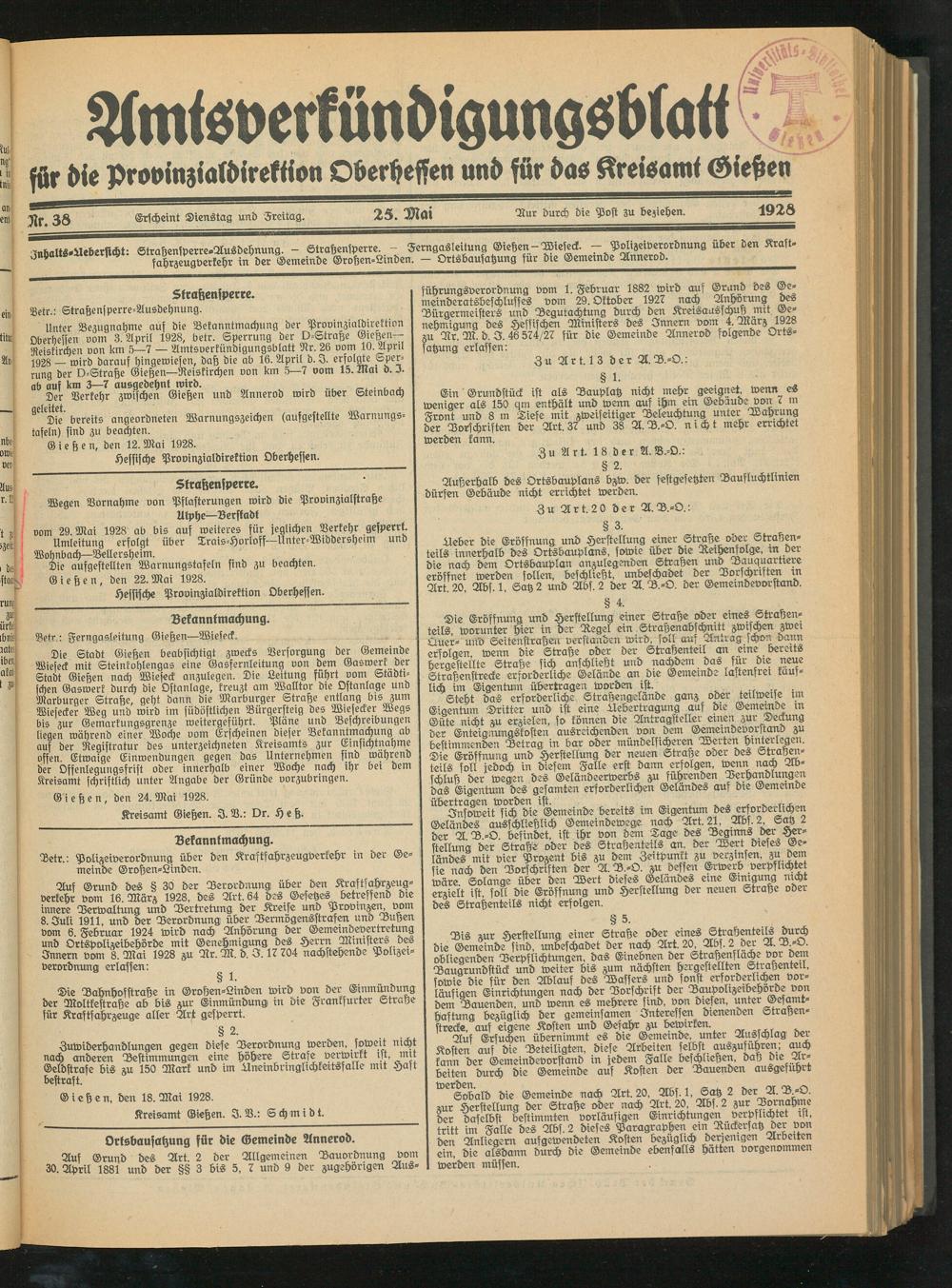 ^nbalts.Aeberstcht: Straßensperre-Ausdehnung. - Straßensperre. - Ferngasleitung Gießen-Wieseck. — Polizeiverordnung über den Kraft- $ fahrzeugverkehr in der Gemeinde Großen-Linden. — Ortsbausatzung für die Gemeinde Annerod.
