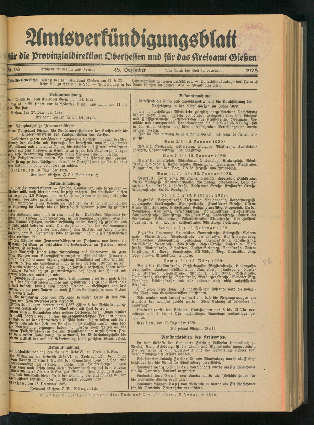 Iichalts'Aebersicht: ©icnft bei dem Kreisamt Gießen am 31. d. M. — Pyosphorhaltige Feuerwerkskörper. — Schlachthausanlage des Heinrich Kehr VI. zu Treis a. d. Lda. — Nacheichung in der Stadt Gießen im Jahre 1929. - Dienstnachrichten.