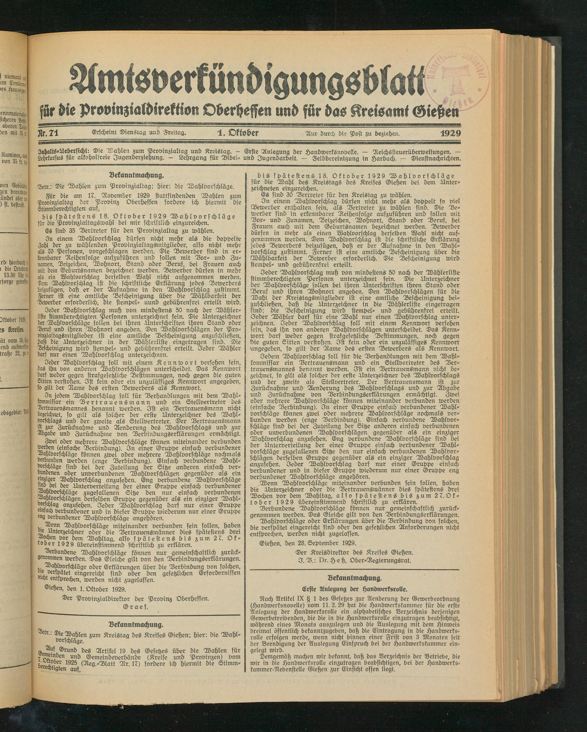Mr die am 17. November 1929 stattfindenden Wahlen zum Provinzialtag der Provinz Oberhessen fordere ich hiermit die Stimmberechtigten aus,