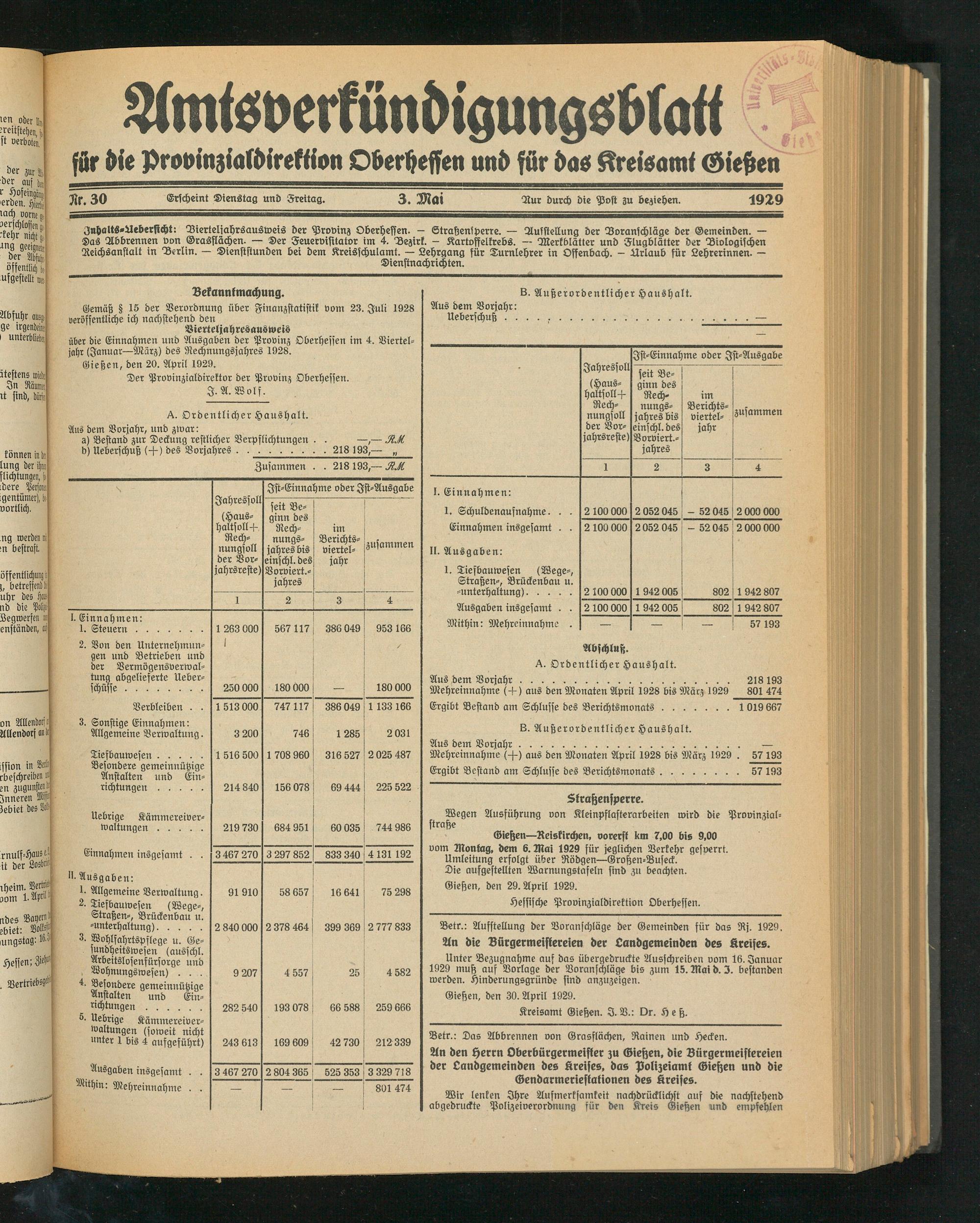Juhalts-Ueberficht: Dierteljahrsausweis der Provinz Oberheffen. — Straßensperre. — Ausstellung der Voranschläge der Gemeinden. — Das Abbrennen von Grasflächen. — Der Feuervisitator im 4. Bezirk. - Kartoffelkrebs. — Merkblätter und Flugblätter der Biologischen Aeichsanstalt in Berlin. — Dienststunden bei dem Kreisschulamt. — Lehrgang für Turnlehrer in Offenbach. - Urlaub für Lehrerinnen. — Dienstnachrichten.