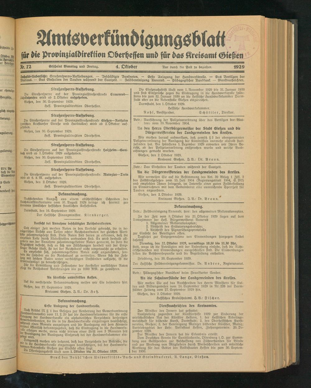 Inhalts-Aebersicht: Strahensperre-Aufhebungen. — Beschädigte Banknoten. - Erste Anlegung der Handwerksrolle. — Das Vertilgen der Blutlaus. — Das Einhalten der Tauben während der Saatzeit. — Feldbereinigung Annerod. — Pädagogischer Rundfunk. — Dienstnachrichten.
