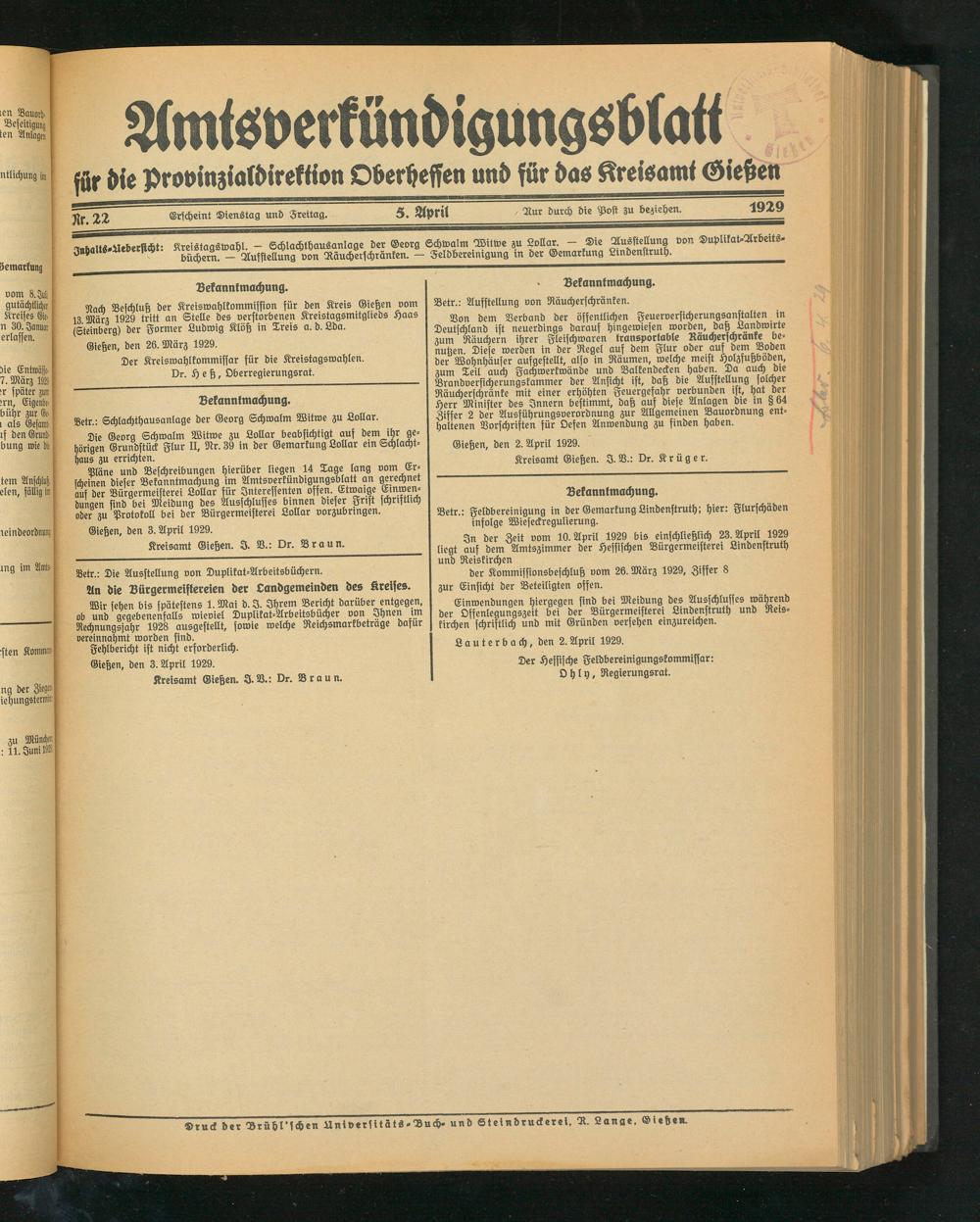 ^balts-Aeberstcht: Kreistagswahl. - Schlachthausanlage der Georg Schwalm Witwe zu Lollar. - Die Ausstellung von Duplikat-Arbeits. Inhacks -y büchern. — Aufstellung von Räucherschränken. — Feldberernigung in der Gemarkung Lindenstruth.