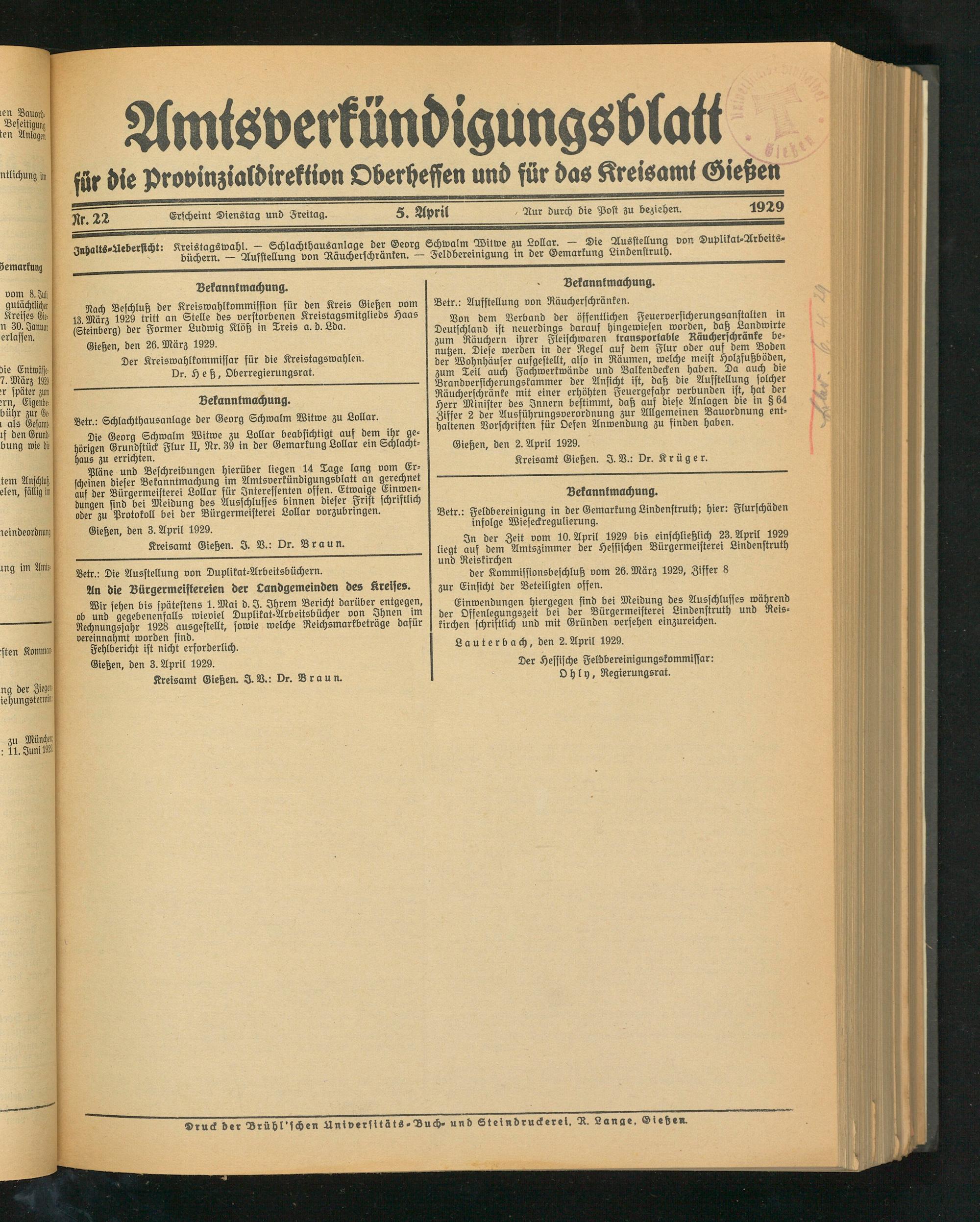 Kreisamt Gießen. I. V.: Dr. Krüger.