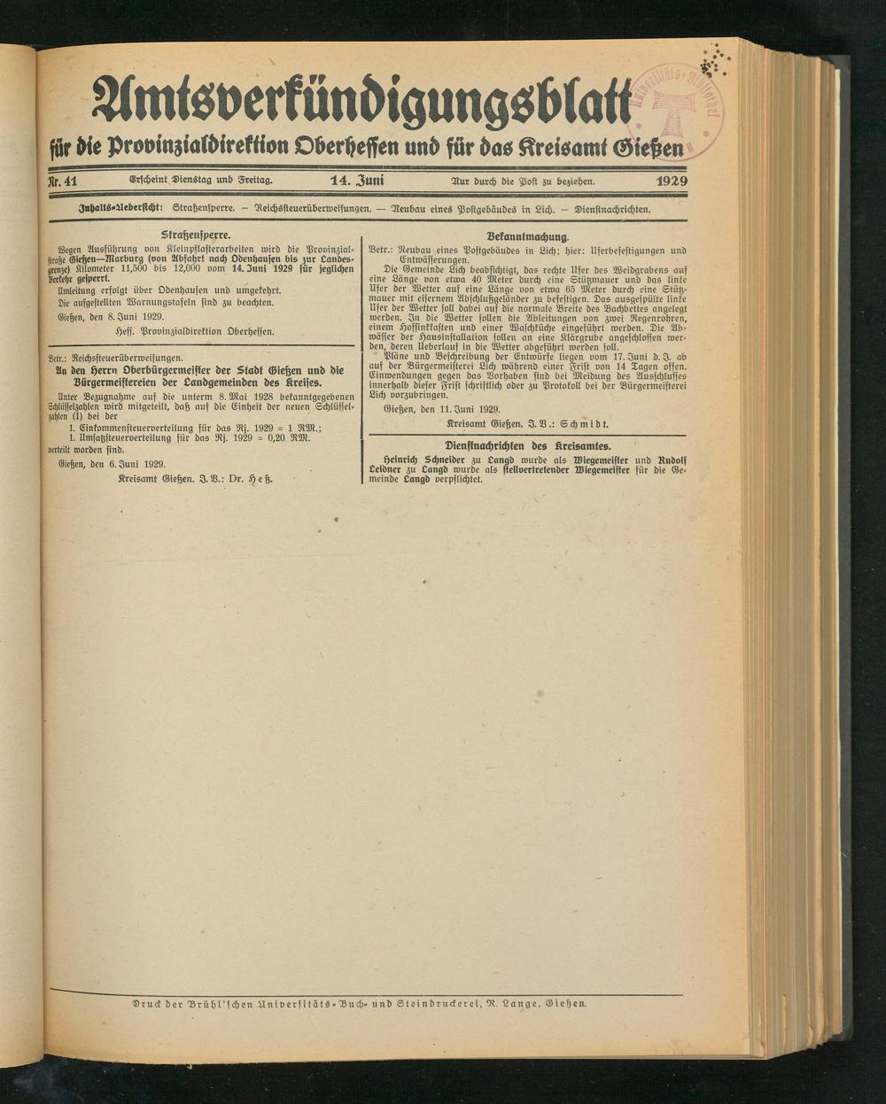 x 41 Erscheint Dienstag und Freitag. 14. Juni Nur durch die Post zu beziehen. 1929