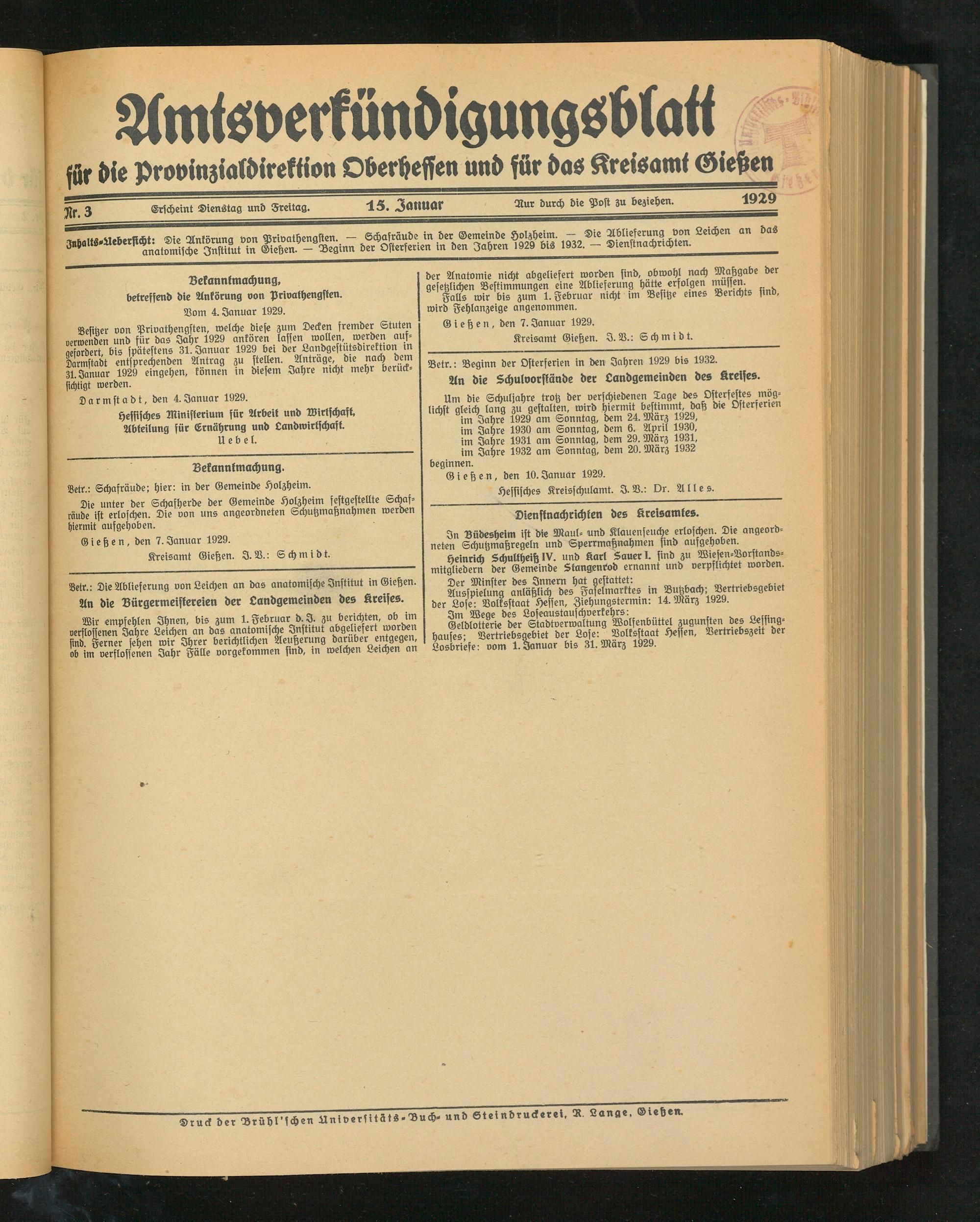 für die Provinzialdirektion Oberheffen und für das Kreisamt Gießen