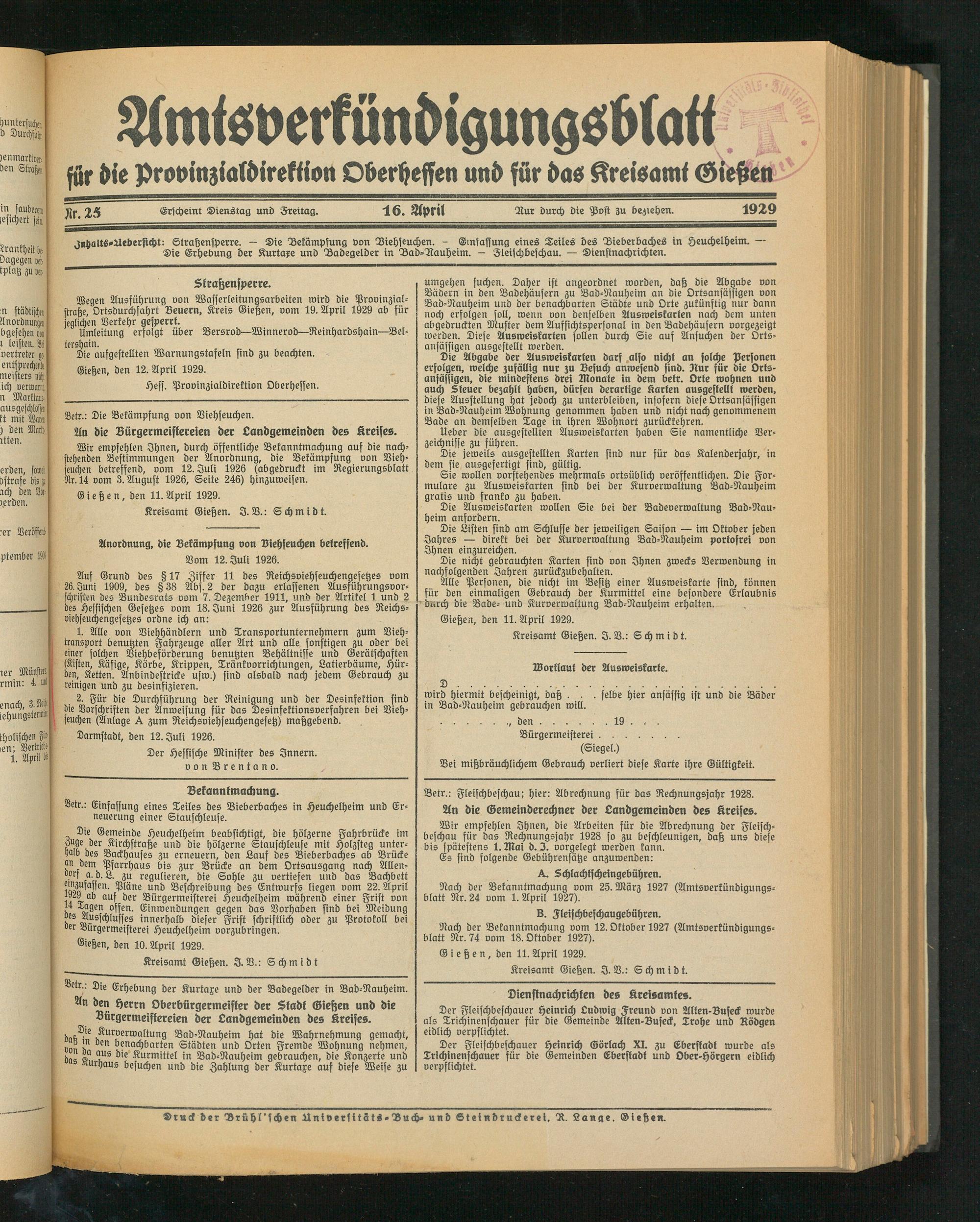 für die Provinzialdirektion Oberheffen und für das Kreisamt Gießen