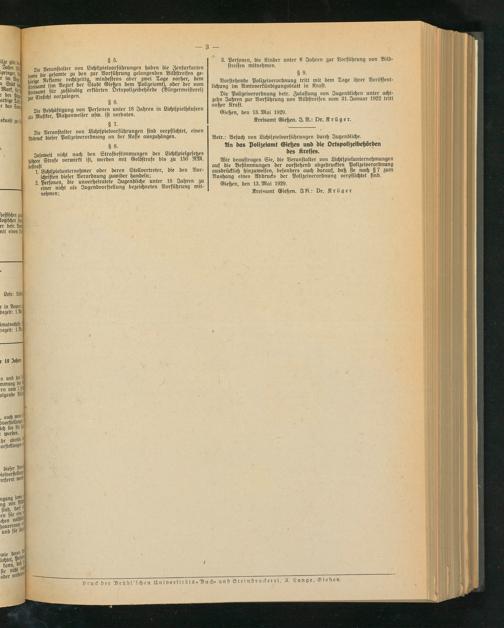 Wir beauftragen Sie, die Veranstalter von Lichtspielunternehmungen auf die Bestimmungen der vorstehend abgedruckten Polizeiverordnung ausdrücklich hinzuweisen, besonders auch darauf, daß sie nach § 7 zum Aushang eines Abdrucks der Polizeiverordnung verpflichtet sind.