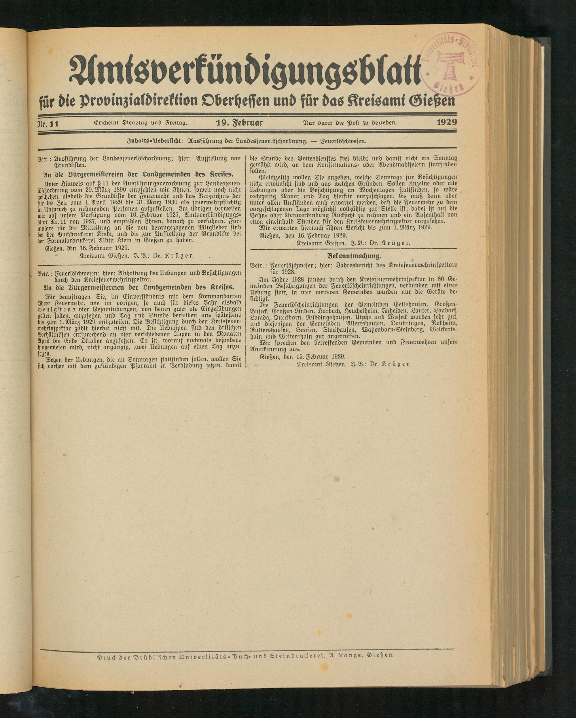 Unter Hinweis auf § 11 der Ausführungsverordnung zur Landesfeuerlöschordnung vom 29. März 1890 empfehlen wir Ihnen, soweit noch nicht geschehen, alsbald die Grundliste der Feuerwehr und das Verzeichnis der für die Zeit vom 1. April 1929 bis 31. März 1930 als feuerwehrpflichtig in Anspruch zu nehmenden Personen aufzustellen. Im übrigen verweisen wir auf unsere Verfügung vom 10. Februar 1927, Amtsverkündigungs- blatt Nr. 11 von 1927, und empfehlen Ihnen, danach zu verfahren. Formulare für die Mitteilung an die neu herangezogenen Mitglieder find bei der Buchdruckerei Kindt, und die zur Aufstellung der Grundliste bei der Formulardruckerei Albin Klein in Gießen zu haben.