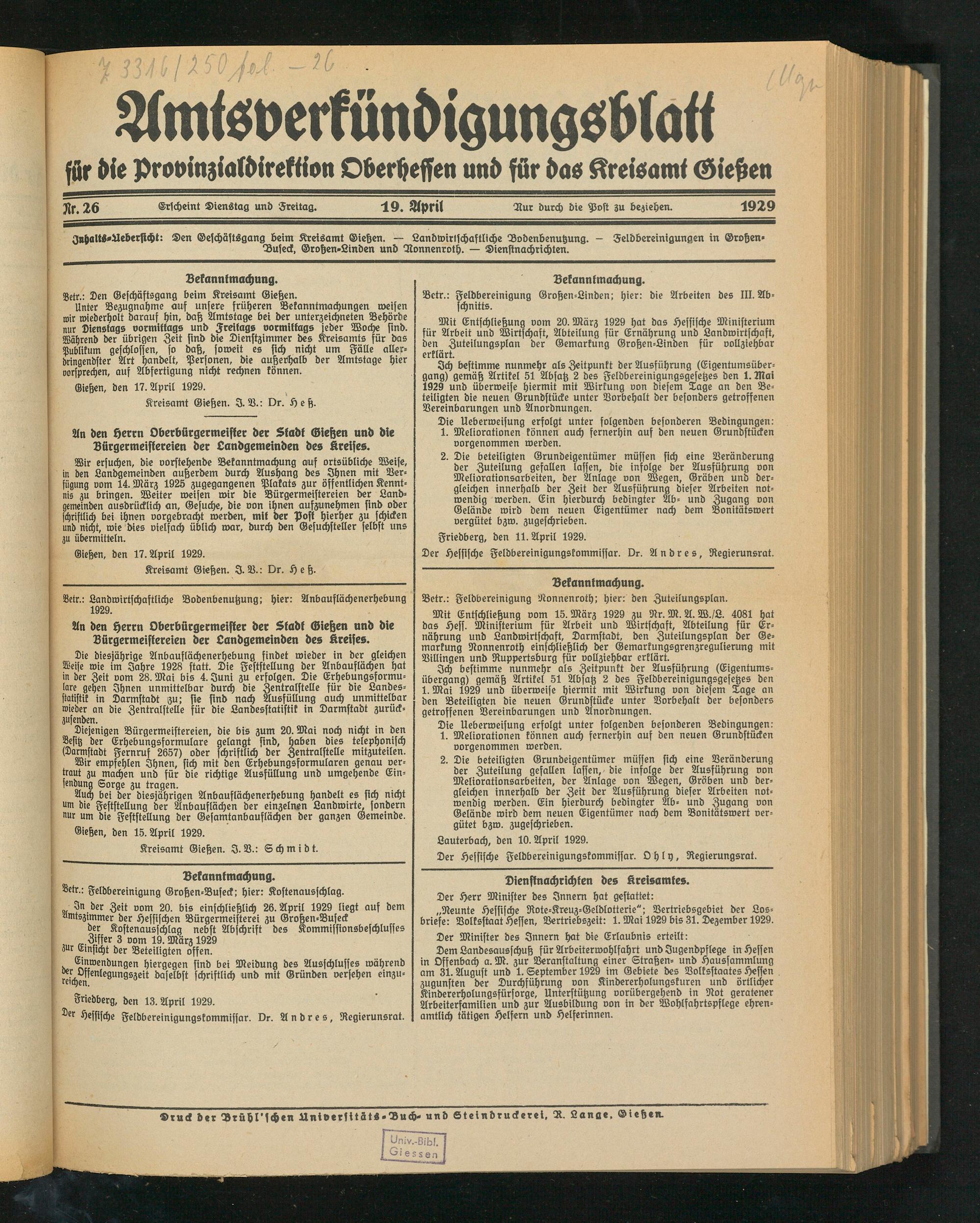 Kreisamt Gießen. I. V.: Dr. Heß.