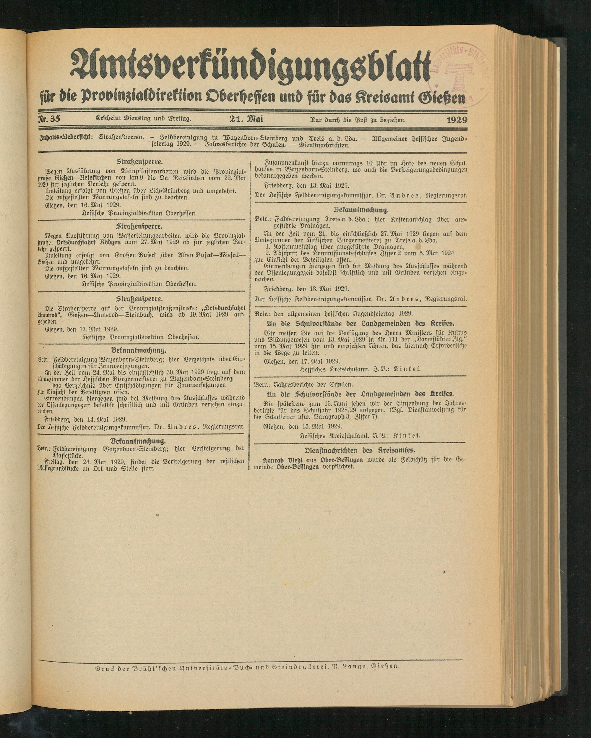 Jnhalts-Aeberficht: Straßensperren. - Felöbereinigung in Watzenborn-Steinberg und Treis a. d. Lda. — Allgemeiner hessischer Jugendfeiertag 1929. — Jahresberichte der Schulen. — Dienstnachrichten.