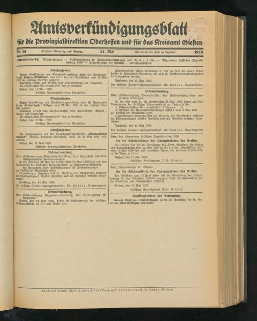 Wir weisen Sie auf die Verfügung des Herrn Ministers für Kultus und Bildungswesen vom 13. Mai 1929 in Nr. 111 der „Darmstädter Ztg." vom 15. Mai 1929 hin und empfehlen Ihnen, das hiernach Erforderliche in die Wege zu leiten.