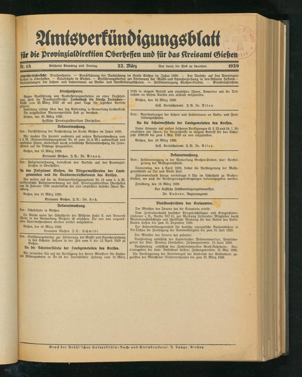 gichaltS-LIebrrstcht: Straßensperre. — Durchführung der Vacheichung im Kreise Gießen im Jahre 1929. - Ter Verkehr aus den Provinzial- sttühen in Oberhessen. — Schafräude in Gießen. — Einführungskursus zur Förderung der Musik» und Sprecherziehung in den Schulen Hessens.- Beurlaubungen der Lehrer und Lehrerinnen an Volks- und Fortbildungsschulen. — Feldbereinigung Großen-Linden. — Dienstnachrichten.