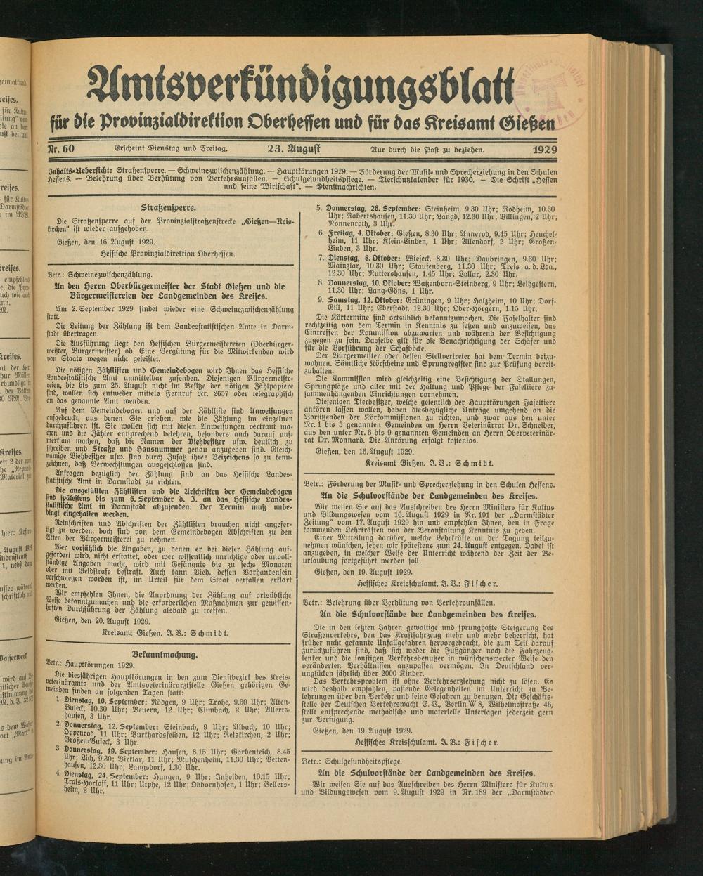 Inhalis-Aebersichk: Straßensperre. — Schweinezwischenzählung. — Hauptkörungen 1929. — Förderung der Musik-- und Sprecherziehung in den Schulen Hessens. — Belehrung über Verhütung von Berkehrsunfällen. - Schulgesundheitspflege. — Tierfchutzkalender für 1930. - Die Schrift „Hessen und feine Wirtschaft". — Dienstnachrichten.