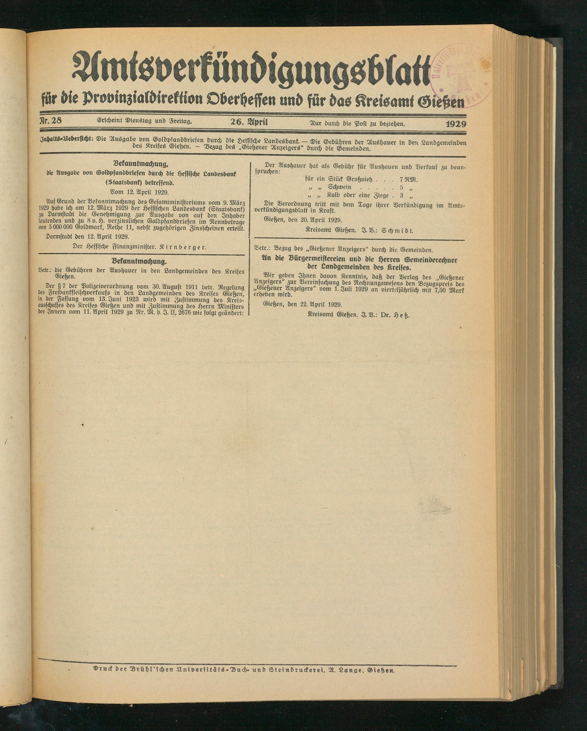 Iuhatts-Aeb-rsicht- Die Ausgabe von Goldpfandbriefen durch die Hessische Landesbank. - Die Gebühren der Aushauer in den Landgemeinden 6ea Kreises Gießen. - Bezug des „Gießener Anzeigers" durch die Gemeinden.