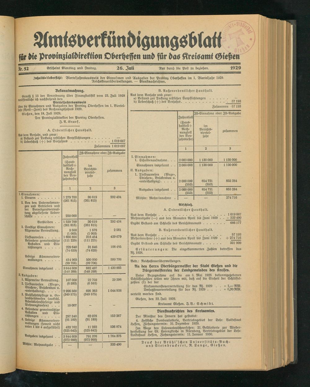 über die Einnahmen und Ausgaben der Provinz Oberhessen im 1. Vierteljahr (April—Juni) des Rechnungsjahres 1929.