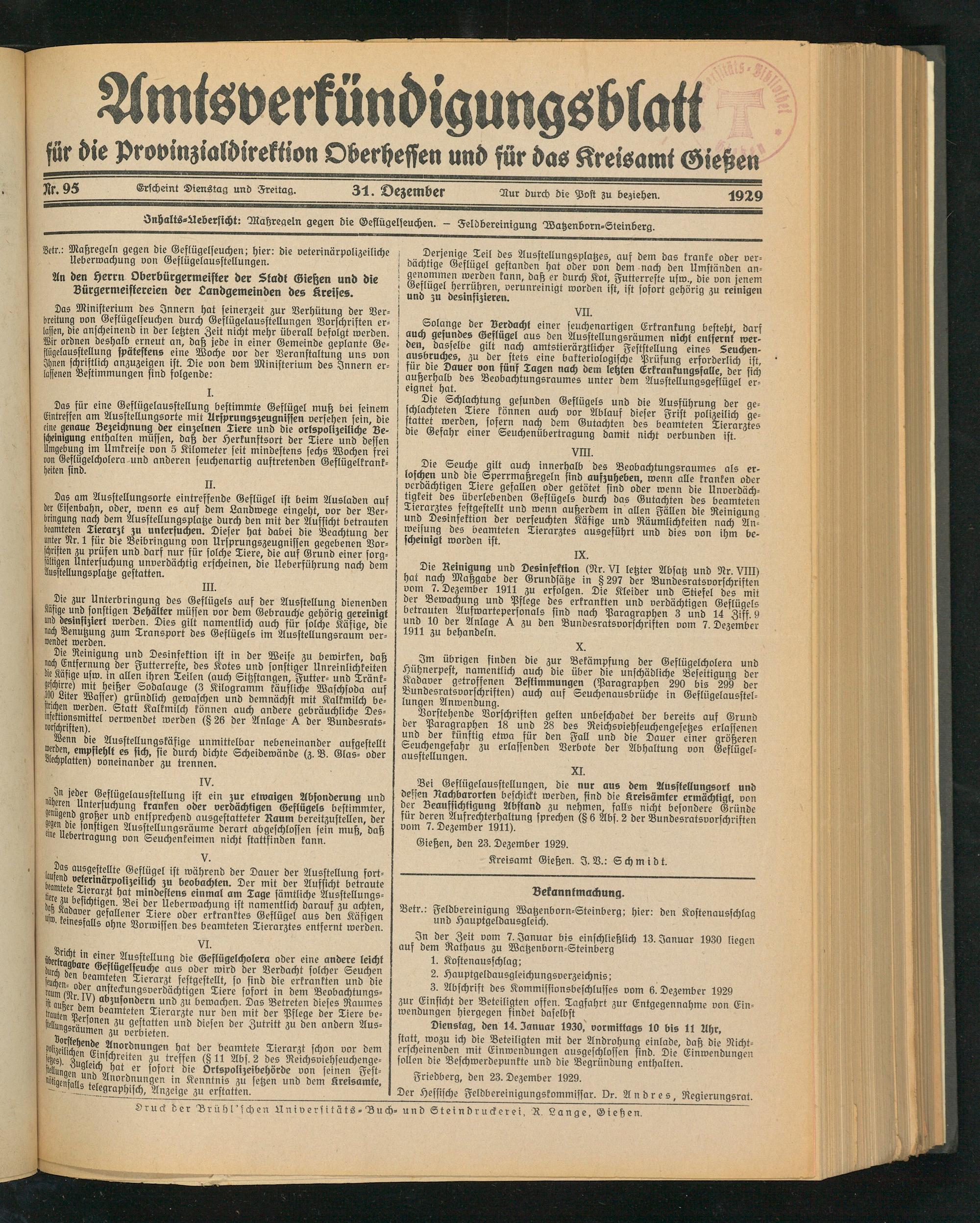 An den Herrn Oberbürgermeister der Stadt Gießen und die Bürgermeistereien der Landgemeinden des Kreises.
