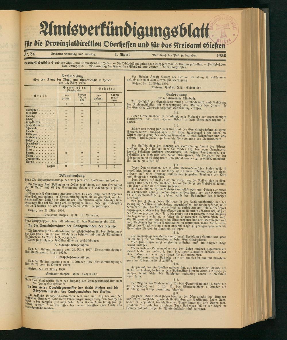 Inhalts-Aebersicht: Stand der Maul- und Klauenseuche in Hessen. — Die Schlachthausanlage des Metzgers KarlDolkmann zu Lollar. - Fleischbeschau. Das Landgestut. — Backordnung der Gemeinden Climbach und Lauter. - Dienstnachrichten.