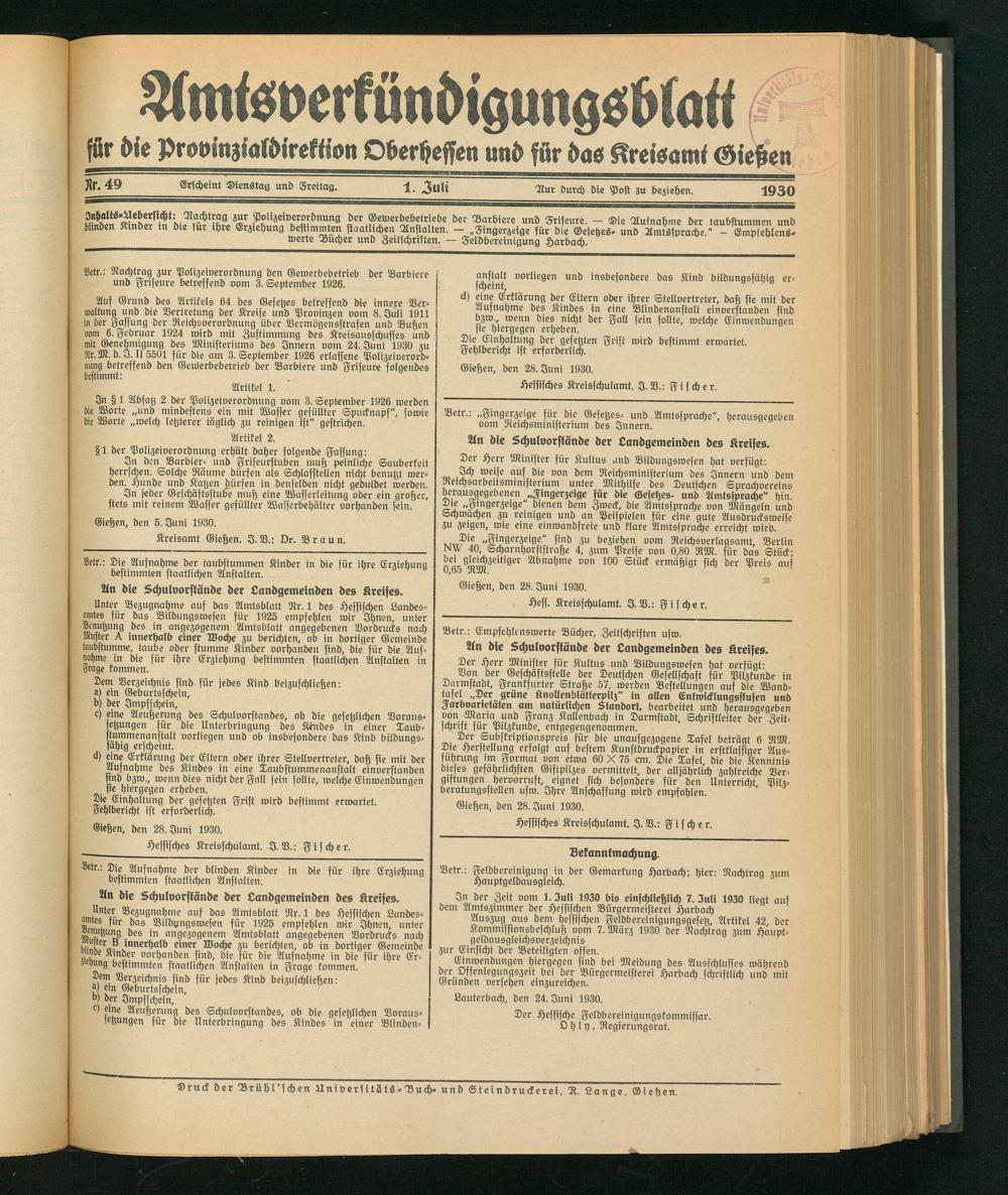 Kreisamt Gießen. I. V.: Dr. Braun.