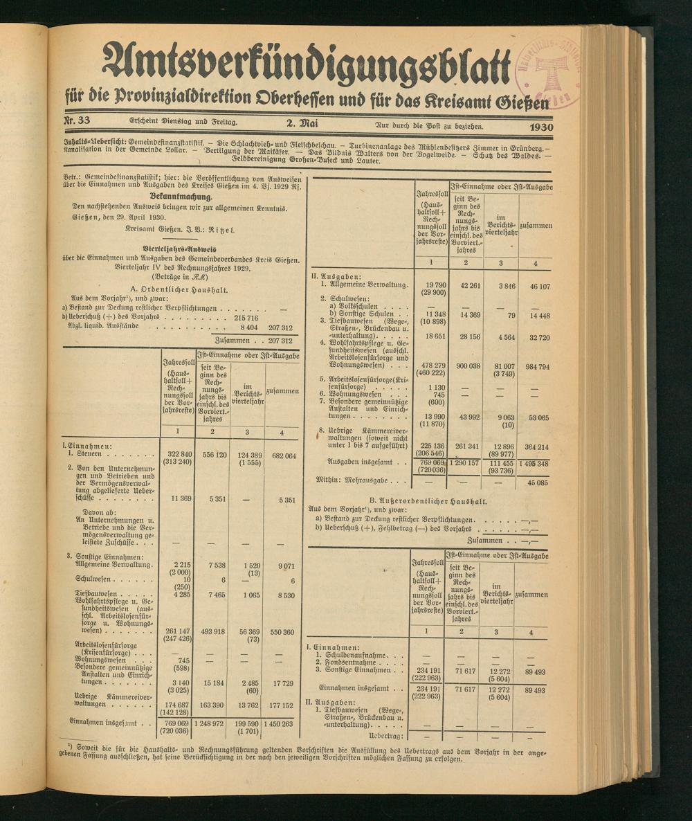 Betr.: Gemeindefinanzstatistik; hier: die Veröffentlichung von Ausweisen über dre Emnahmen und Ausgaben des Kreises Gießen im 4. Vj. 1929 Rj.
