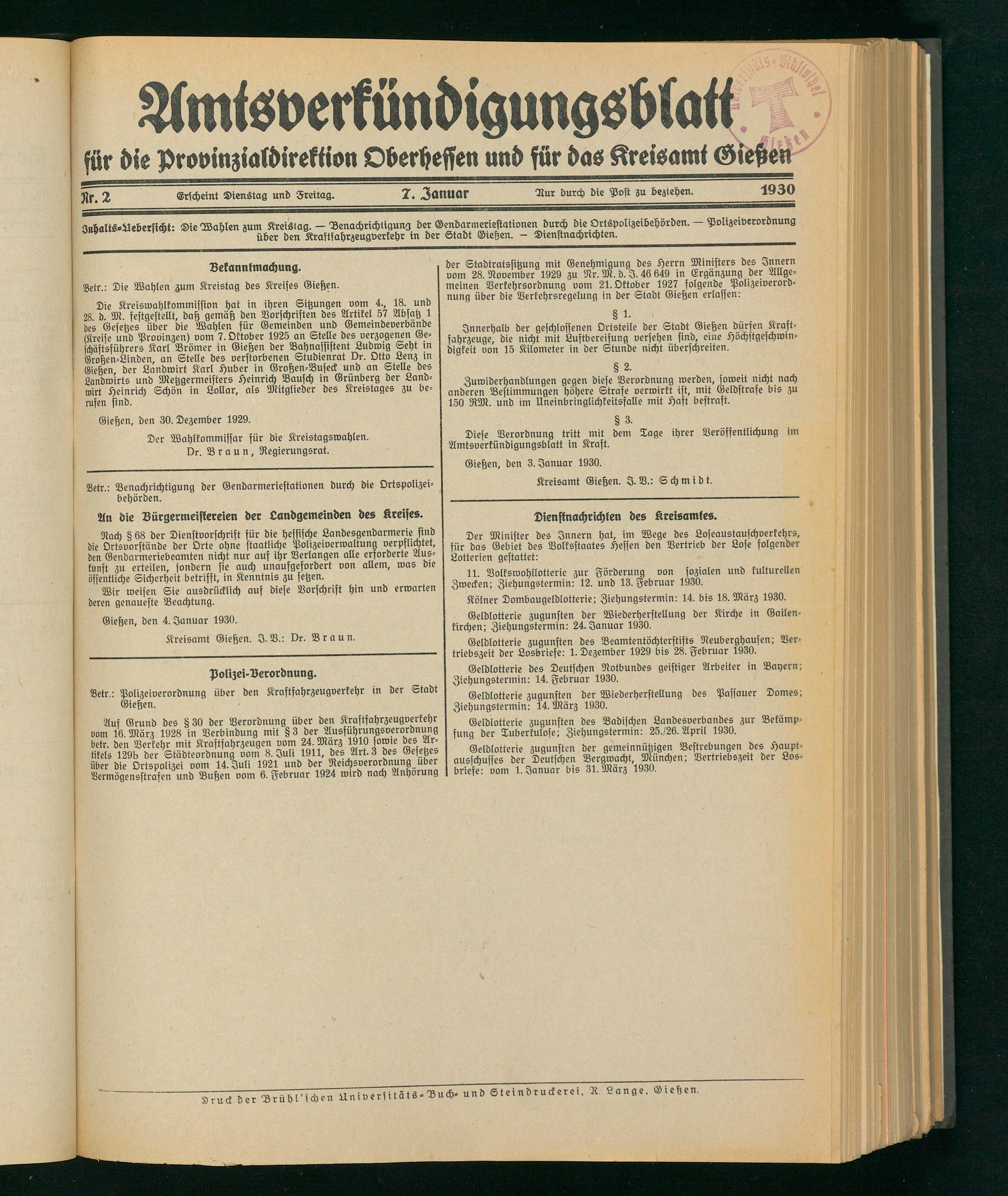 stnbalts-Lebersicht: Die Wahlen zum Kreistag. — Benachrichtigung der Gendarmeriestationen durch die Ortspolizeibehörden. — Polizeiverordnung J über den Krastfahrzeugverkehr in der Stadt Gießen. - Dienstnachrichten.__