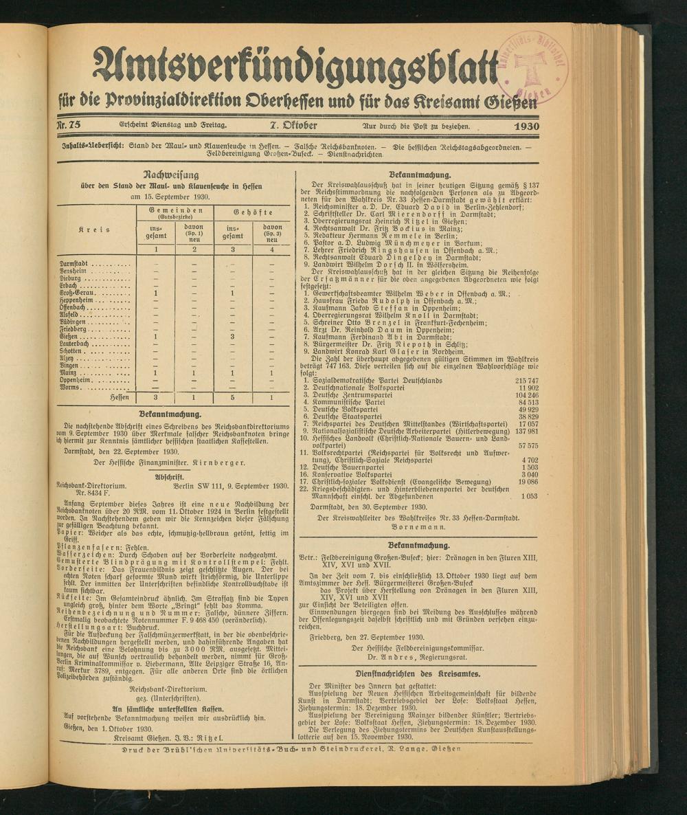 Inhalts-Aebersicht: Stand der Maul- und Klauenseuche in Hessen. - Falsche Aeichsbanknoten. - Die hessischen Aeichstagsabgeordneien. — Feldbereinigung Grohen-Duseck. - Dienstnachrichten.
