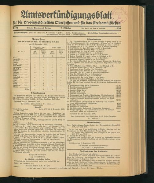 für die Provinzialdirektion Oberheffen und für das Kreisamt Gießen
