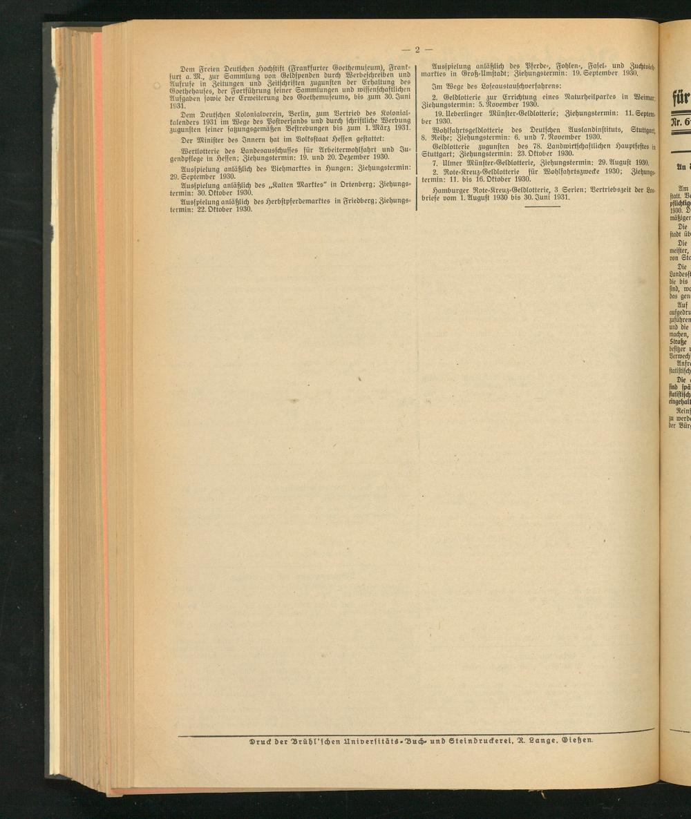 Ausspielung anläßlich des Viehmarktes in Hungen; Ziehungstermin: 29. September 1930.