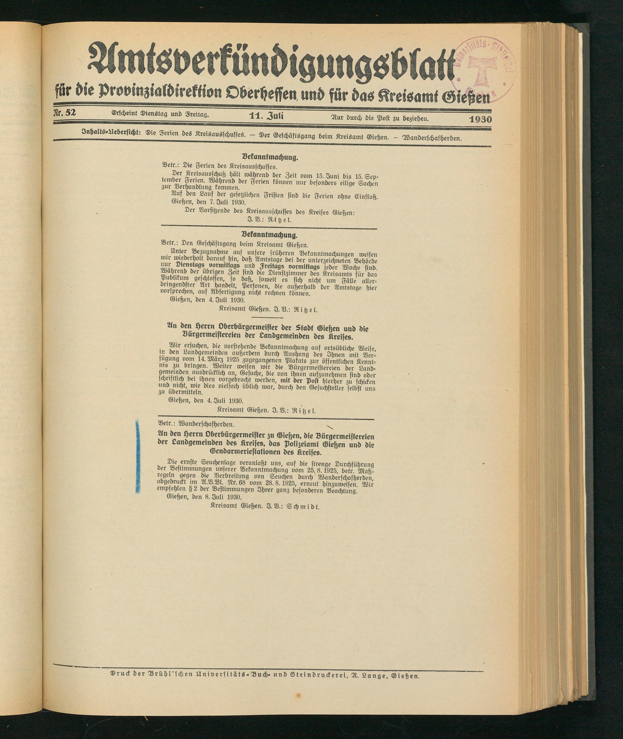 2luf den Lauf der gesetzlichen Fristen sind die Ferien ohne Einfluß Gießen, den 7. Juli 1930.