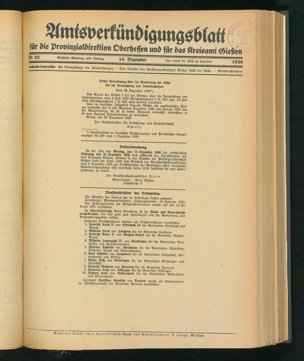 °°n Al?"lag, den 15. Dezember 1930 bis einschließlich Di£n5fag, den 30. Dezember 1930 liegt während den Dienststunden auf bem Kreisamt Gießen, Zimmer 6, das Kataster der Wassergenossenschaft Gießen links der Lahn nebst dem Beschluß des Genossen chaftsvorstandes Akllnn ^ember 193k' zur Einsichtnahme der Beteiligten osten. Eventuelle zeichneten^zu "stellen^ '""^rhalb dieser Frist schriftlich bei dem Unter-