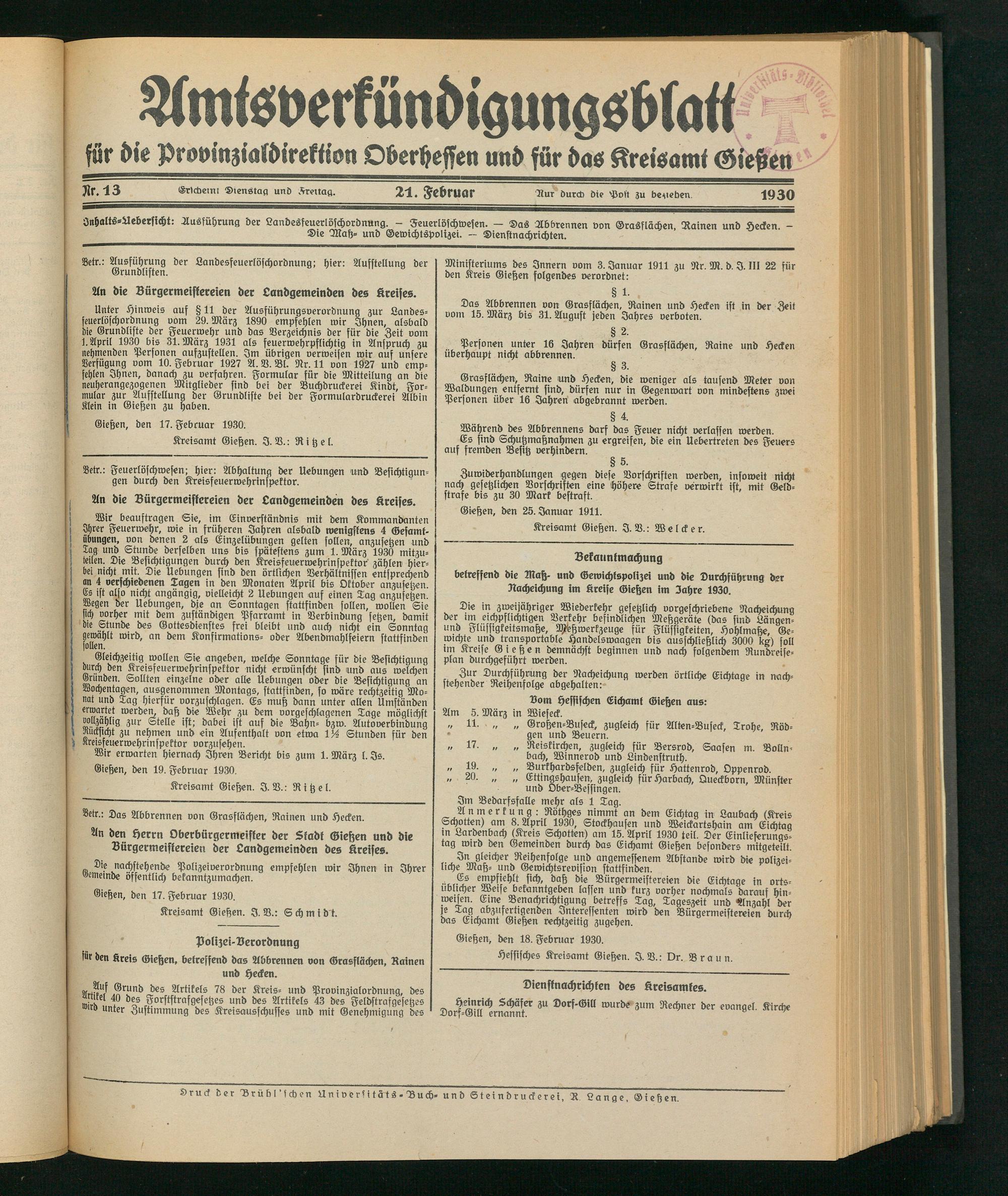 betreffend die Maß- und Gewichlspolizei und die Durchführung der Racheichung im kreise Gießen im Jahre 1930.