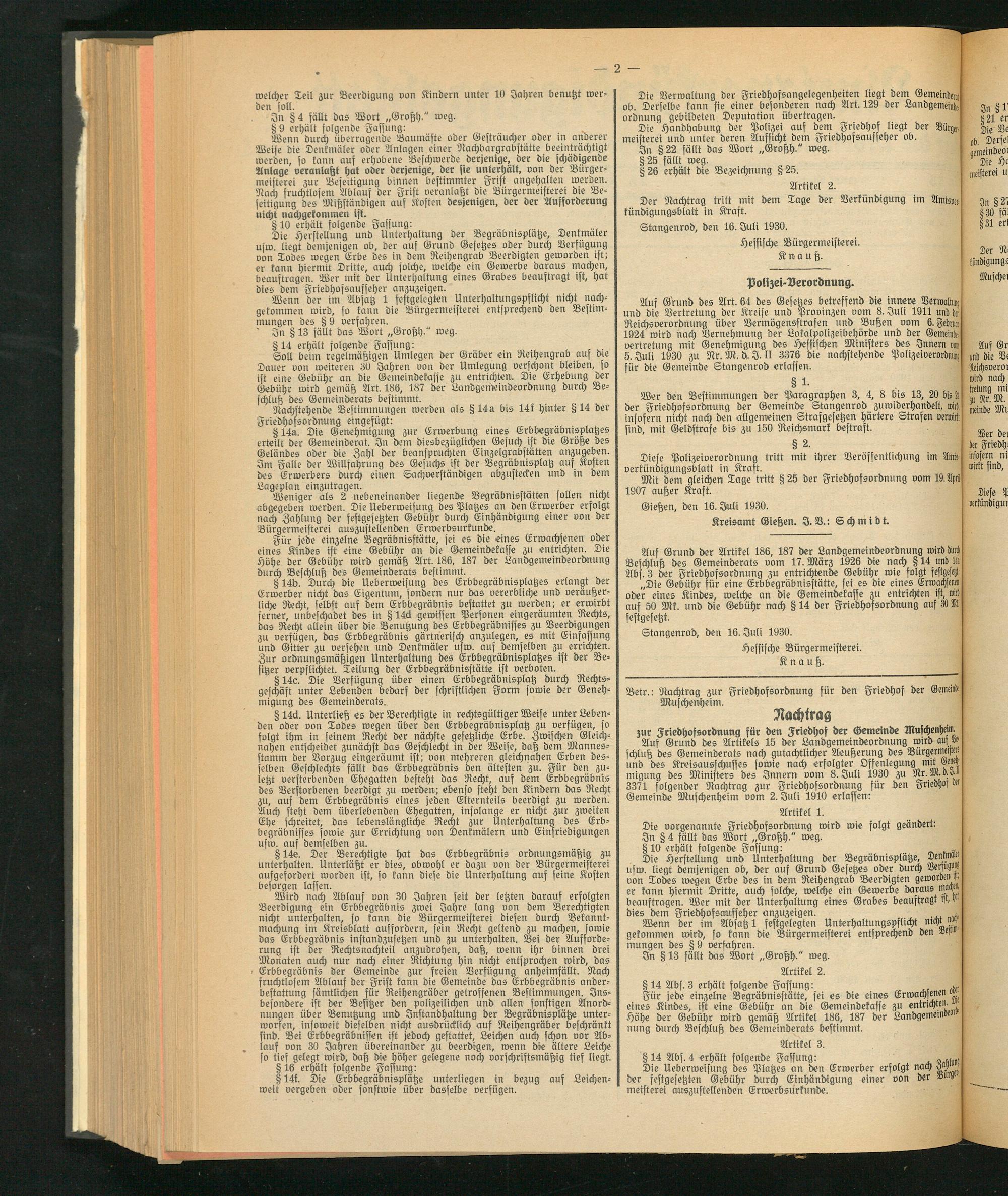 Wer den Bestimmungen der Paragraphen 3, 4, 8 bis 13, 20 bis 21 der Friedhofsordnung der Gemeinde Stangenrod zuwiderhandelt, wich insofern nicht nach den allgemeinen Strafgesetzen härtere Strafen verwiid sind, mit Geldstrafe bis zu 150 Reichsmark bestraft.