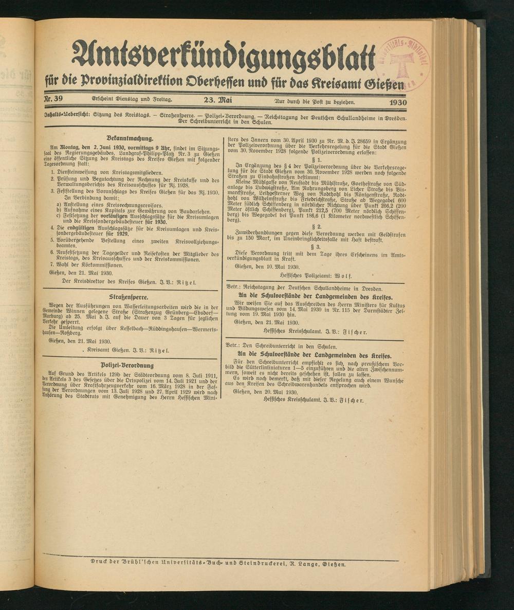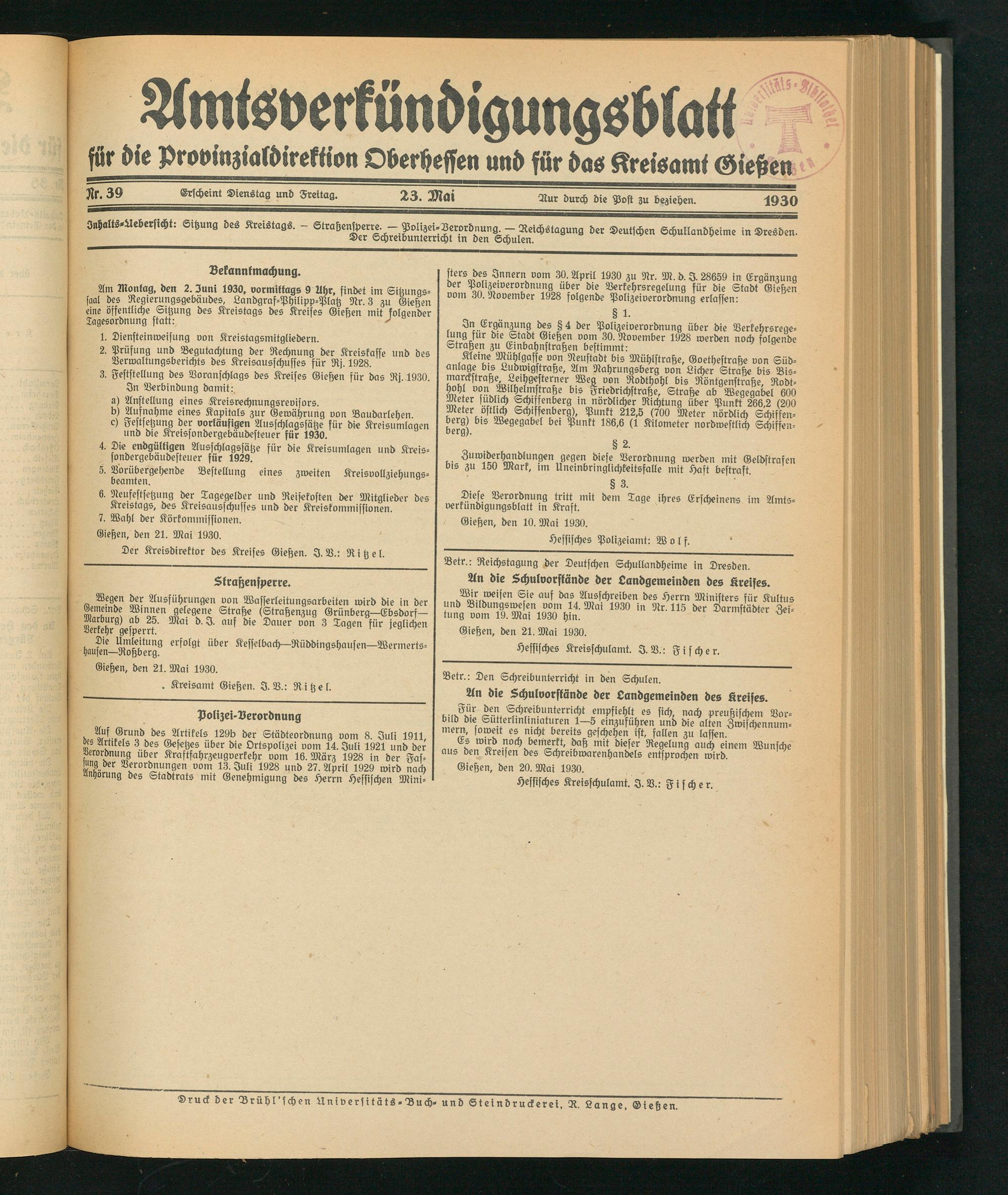Am Montag, den 2.3uni 1930, vormittags 9 Uhr, findet im Sitzungssaal des Regierungsgebäudes, Landgraf-Philipp-Platz Nr. 3 zu Gießen eine öffentliche Sitzung des Kreistags des Kreises Gießen mit folgender Tagesordnung statt: