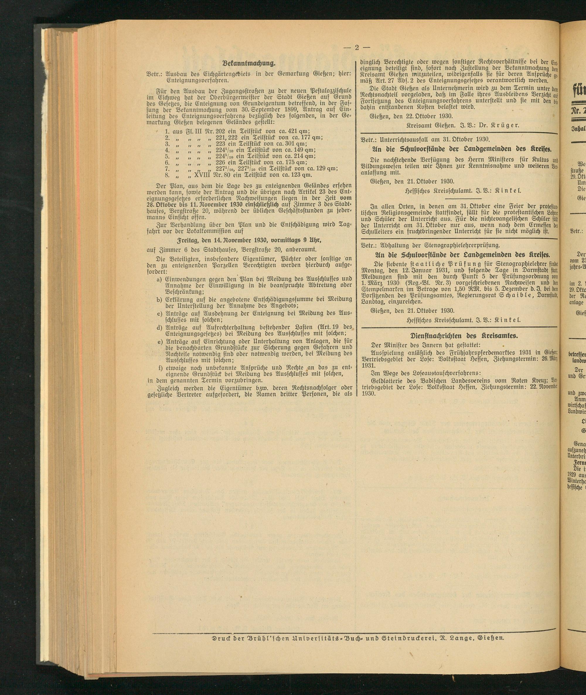 Für den Ausbau der Zugangsstraßen zu der neuen Pestalozzischule im Eichweg hat der Oberbürgermeister der Stadt Gießen auf Grund des Gesetzes, die Enteignung von Grundeigentum betreffend, in der Fassung der Bekanntmachung vom 30. September 1899, Antrag auf Einleitung des Enteignungsverfahrens bezüglich des folgenden, in der Gemarkung Gießen belegenen Geländes gestellt: